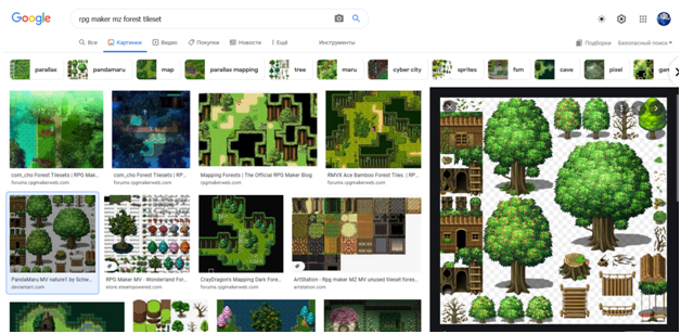 К рисованию мы обратимся в расширенном курсе по мукеру, поэтому давайте пока воспользуемся тем, что гугл пошлет! Отворяем браузер и забиваем в строку поиска, например «rpg maker mz forest tileset» – ну вот не нравятся мне стандартные деревья, хоть ты тресни. Хочу маппить леса нормальные, красивые, чтобы прям ух!