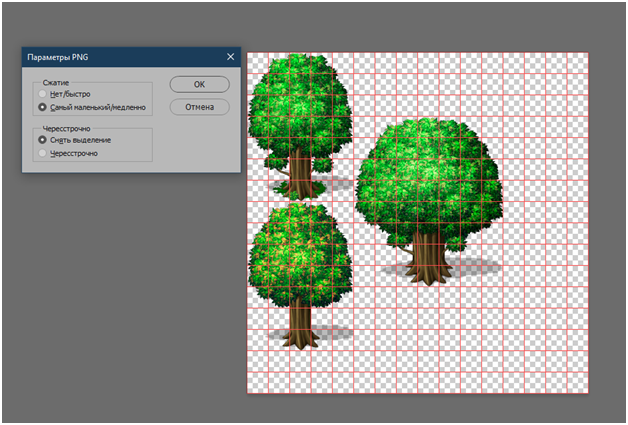 Параметры PNG оставляем те, что предлагает ФШ, т.е. медленное сжатие со снятым выделением.