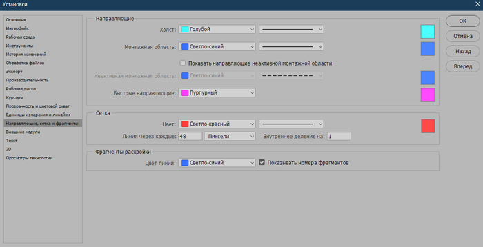 Открыли? Теперь нужно наложить на него сетку 48х48 пикселей. Кто знает как – тот молодца, а остальные запоминайте: Ctrl+K -> Направляющие сетка и фрагменты -> раздел «Сетка» -> Линии через каждые: -> ставим 48 пикс., в графе Внутреннее деление на: ставим 1. Цвет ставим какой-нибудь яркий, например красный, как у меня.