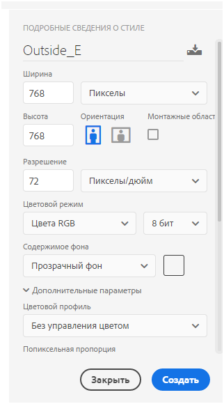 Создадим чистый лист 768х768 пикселей и обзовем его Outside_E