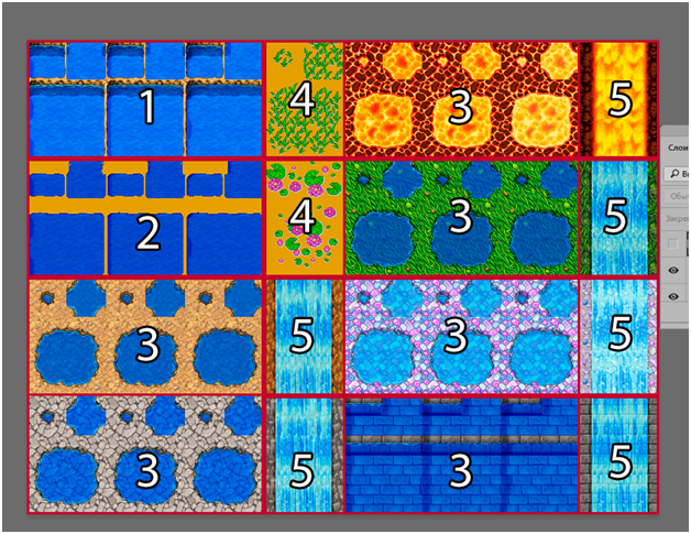Боковины (2) нужны для отрисовки границ автотайла. Они тоже являются бесшовными, но только по вертикали, либо по горизонтали, в зависимости от того, какую боковину мы имеем ввиду.
