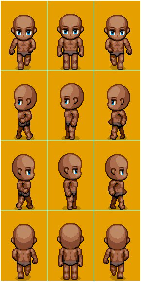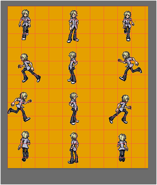 Анимации состоят из четырех рядов, для отображения четырех направлений – вниз, влево, вправо и вверх, соответственно. Центральные из трех кадров отвечают за изображение стоящего на месте ивента.