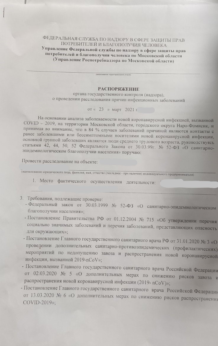 Так же вызывает вопрос оформление Распоряжения и список требований подлежащих проверке, который состоит из списка различных санпинов и постановлений, большинство которых не относятся к моей деятельность, либо в них не идет речь о масках или СИЗах.