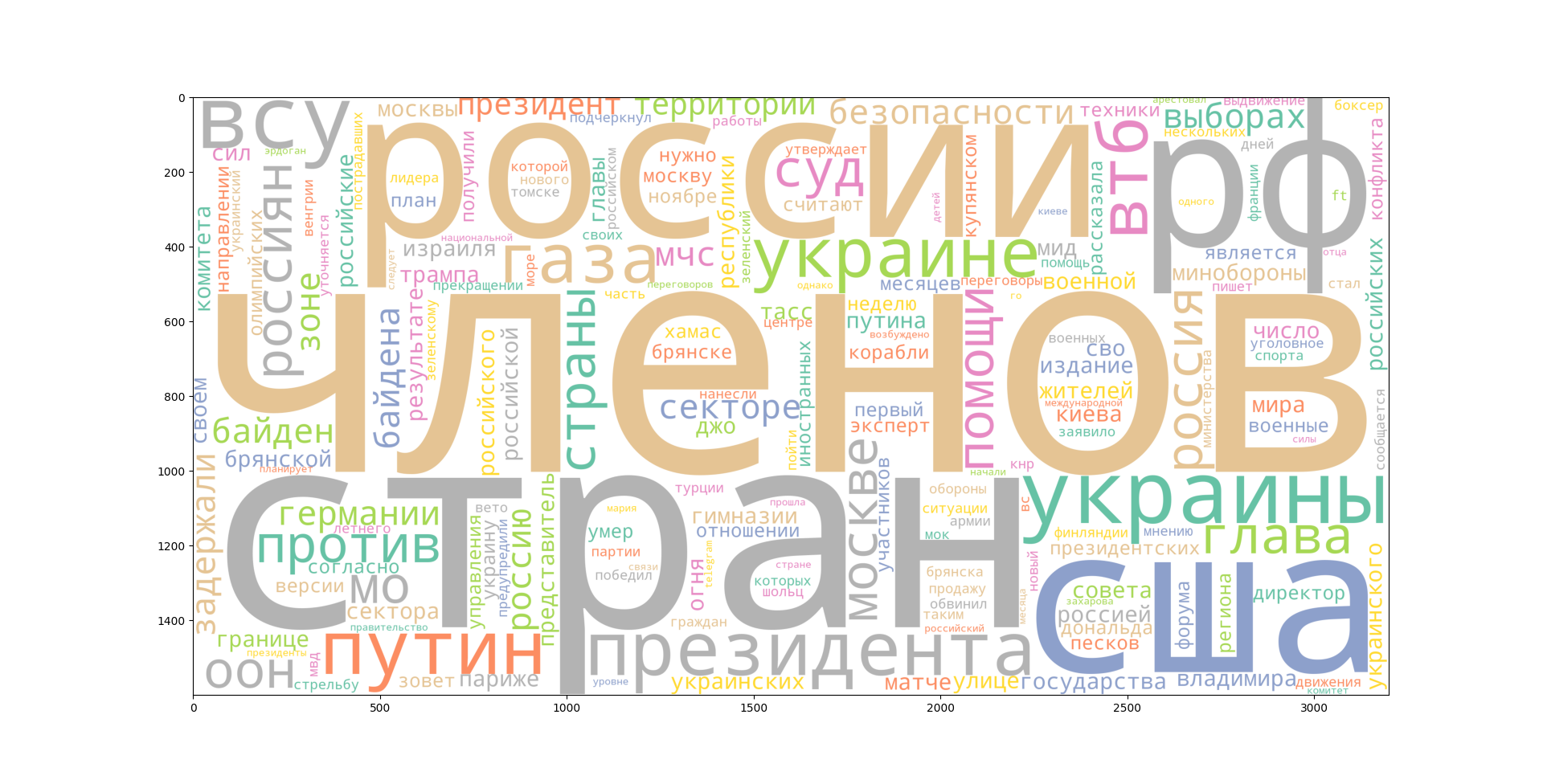 10.12.2023 г. по результатам RSS парсинга популярных новостных лент в России и частотного анализа полученного текста при помощи закона Ципфа, а также визуализации слов в виде облака, наблюдал такую картинку...