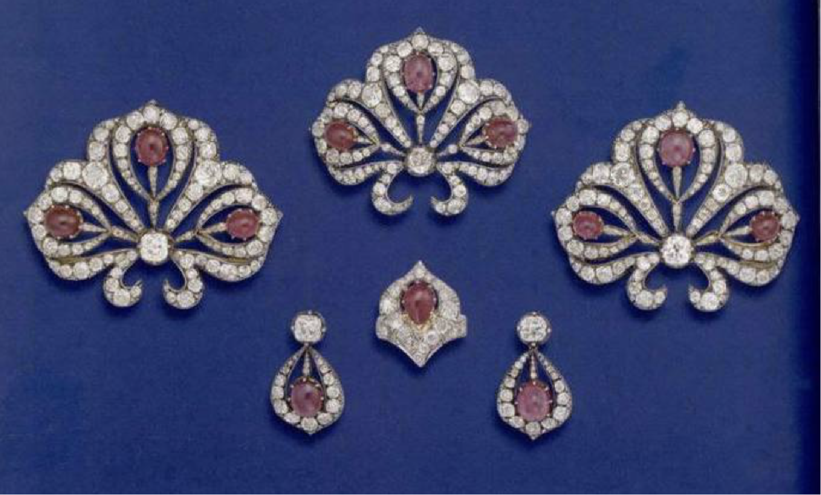В набор входят: бриллиантовый венец, растительный рисунок которого акцентирован красными рубинами, ожерелье из огранённых кушоном бриллиантов, чередующихся с рубиновыми кушонами, кольцо с рубином, огранённым кушоном, массой 9,19 карата, браслет из 12 бриллиантов огранки кушон, величина которых возрастает с приближением к центральному бирманскому рубину в 8,40 карата; серьги и большая брошь – некогда центральное звено – большой овальный рубин которой, массой свыше 12 каратов, замкнут в кольцо равновеликих бриллиантов.