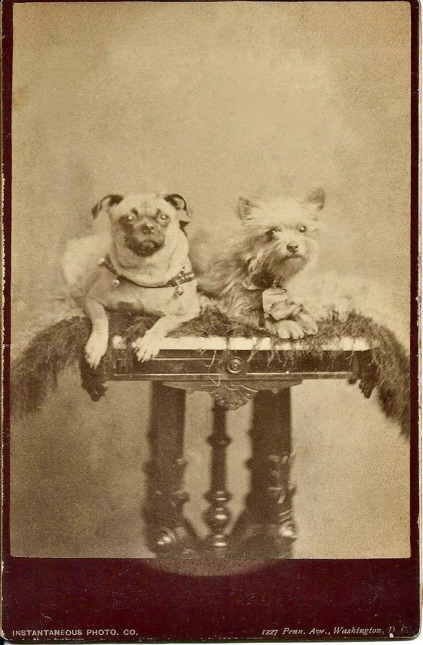 Вашему вниманию представляем фото двух чудесных хвостиков 1880 года. Слева - мопс (да, это породистый мопс второй половины XIX века!), а справа? Справа - терьер по имени Топси. Рождественская фотография была сделана в штате Вашингтон, США. Почему Рождественская? Столик украшен еловыми веточками, на мопсе декоративный ошейник с бубенчиками, а на Топси праздничный бант. Но что же это за терьер, почему в архиве есть запись о его имени, но нет точного указания породы?
