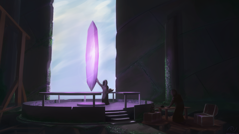 Думаю, если проработать свечение и лучики света между стыками и кристаллом, то может получиться интересный эффект. Но тут страдает сама идея арта - магический кристалл в центре заброшенного сооружения, поросшего мхом. =)