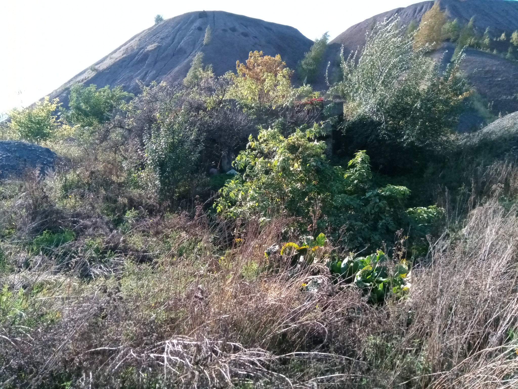 Дальше мы обходим террикон и подходим к остаткам старого скипового (скип - это грубо говоря, лифт для угля/руды/породы. В конкретном случае - через этот ствол вывозили пустую породу во время вскрытия новых пластов угля) ствола 60х годов (на карте обведен желтым).