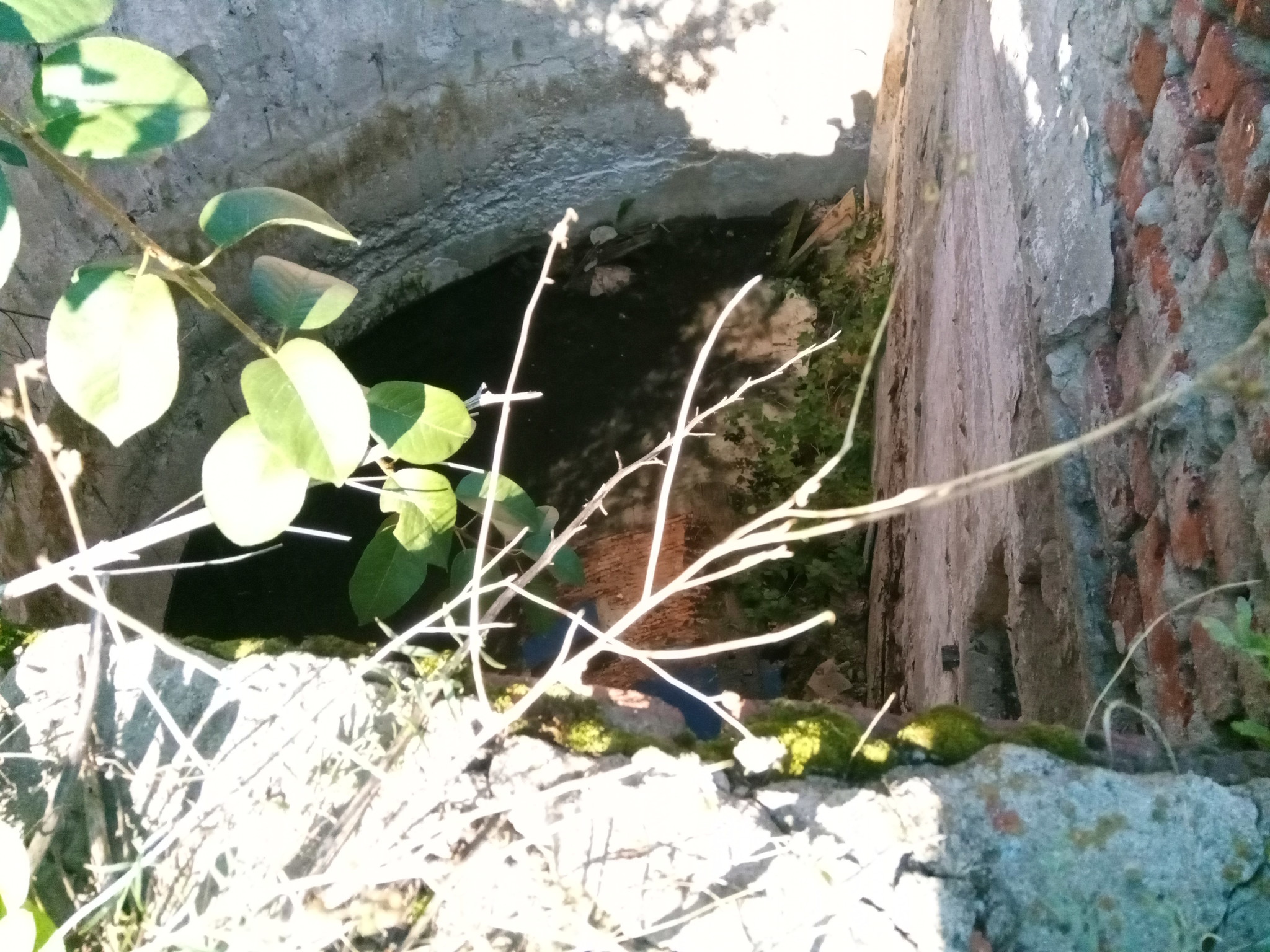 Хоть это и не шахтный ствол, но место в равной степени опасное: глубина затопленной части явно больше полутора метров, а лестницы все спилены. Ловушка в стиле Вьетконга.
