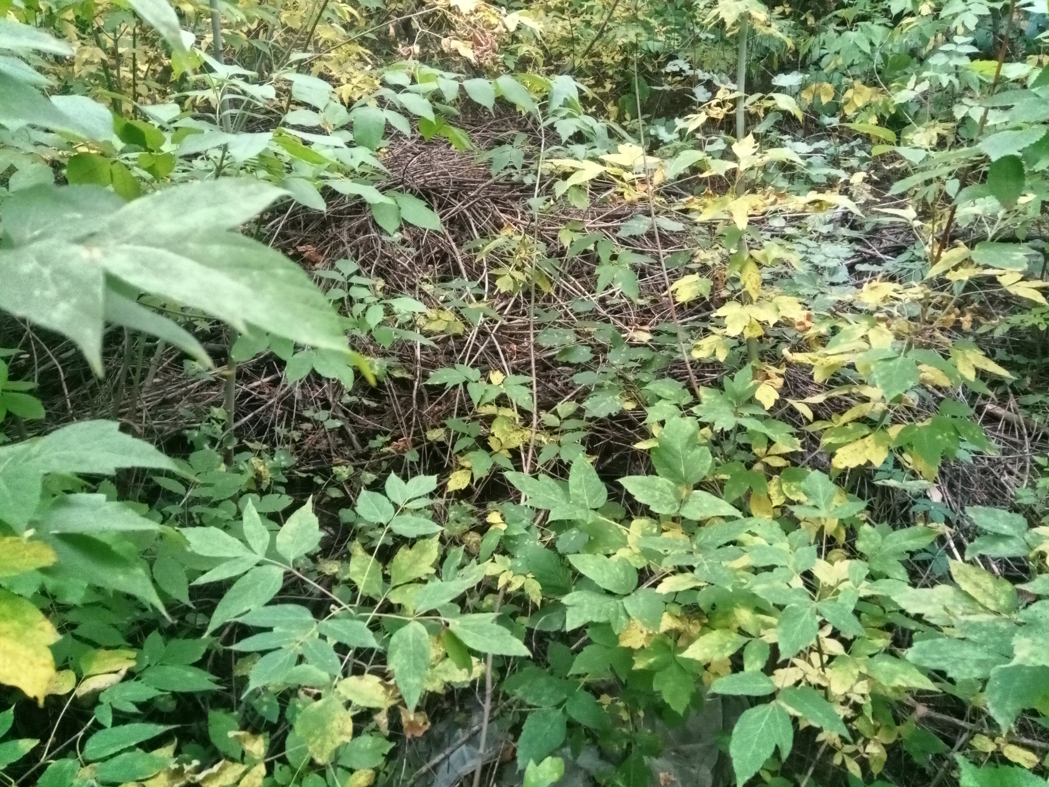 На месте ствола видны две кучи хвороста, разделенные узкой, в 50см, земляной перемычкой.