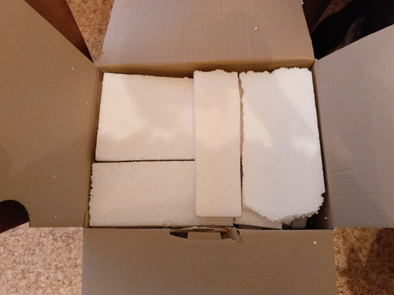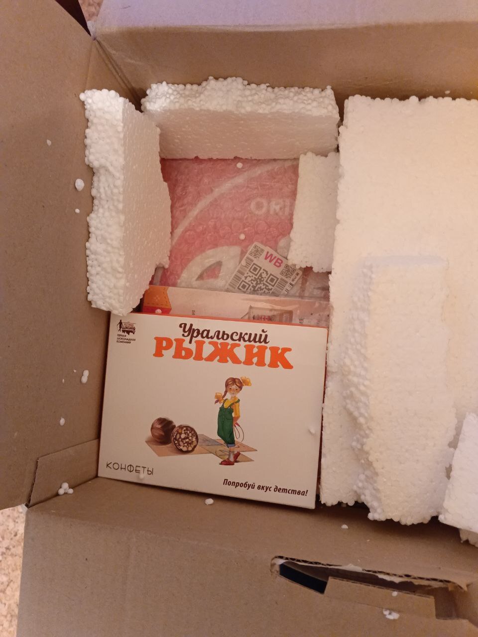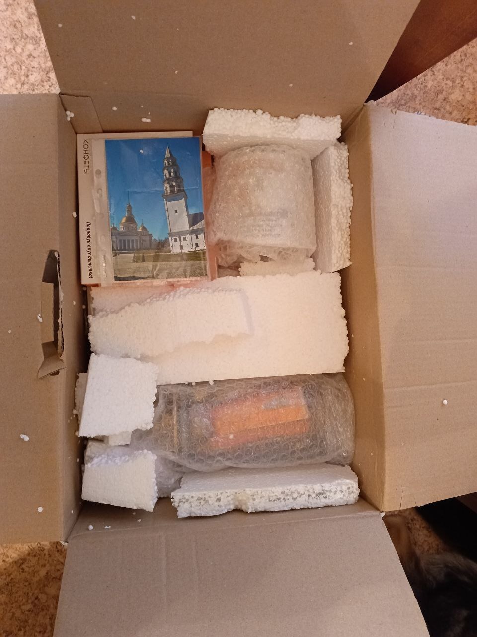 Первым делом я увидела много-много пенопласта, и поняла, что там что-то хрупкое. И ещё сразу видно открыточку - очень приятно, когда пишут про город, откуда подарочек, мне всегда интересно, а открыточки с видами городов я собираю и бережно храню.