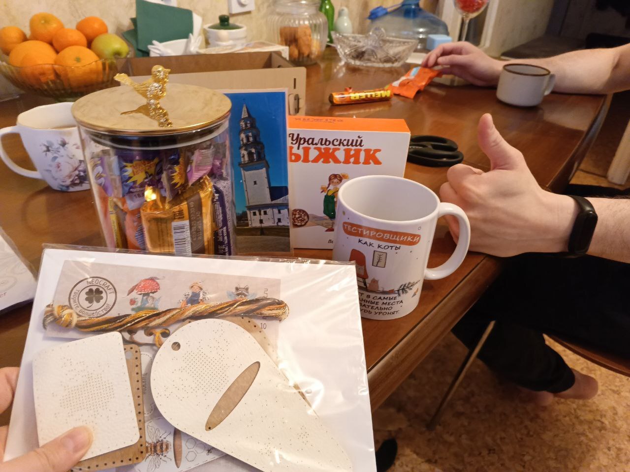 Первым хрупким предметом оказалась кружка. Я как раз недавно стала тестером, тащусь от всяких таких приколов 😁 буду теперь из неё пить на созвонах кофе 👍 (кстати, моя снегурочка тоже тестировщик, может поэтому она так во всё попала?)