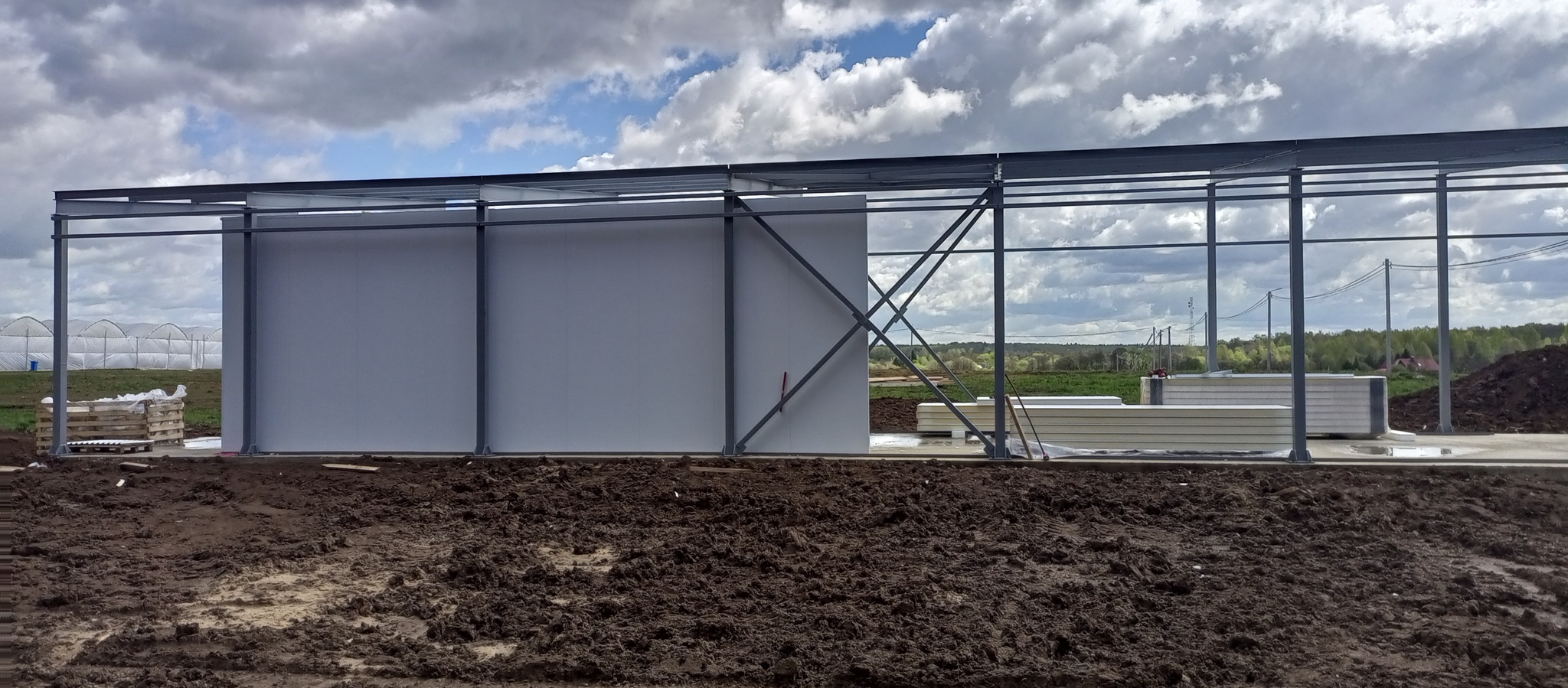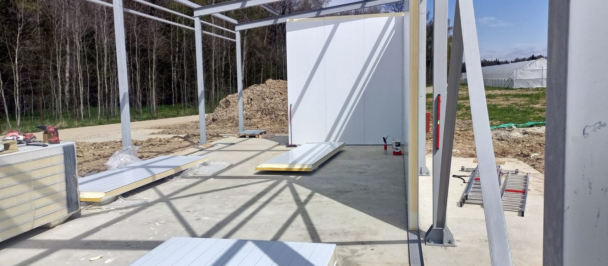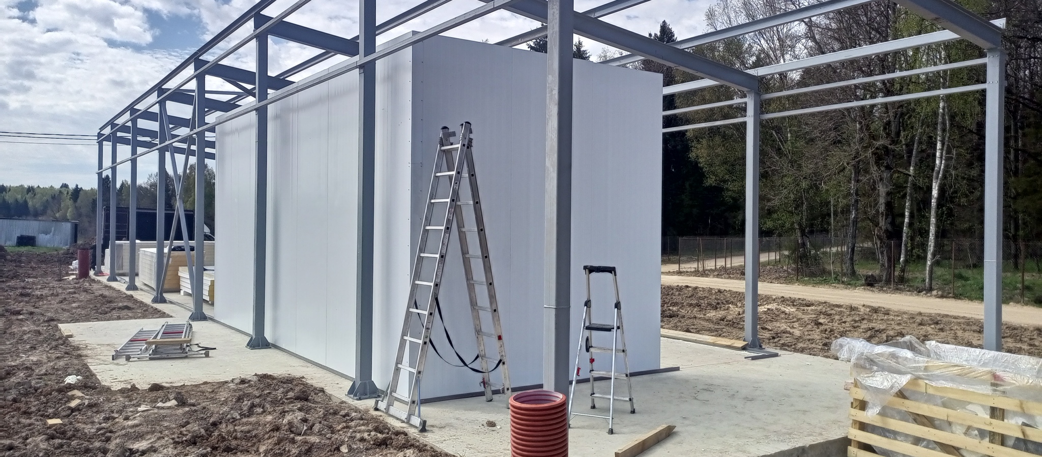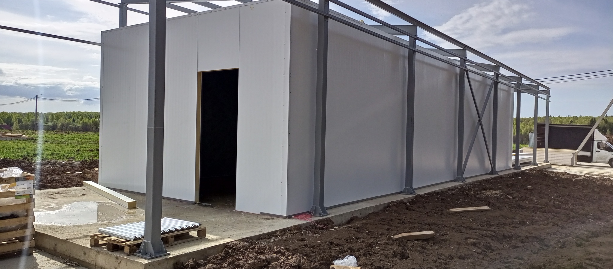 Подвезли пачки сендвич-панелей. 4 метровые на стены и 6 на потолок.