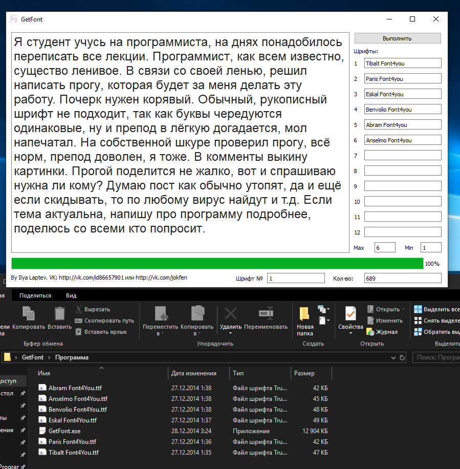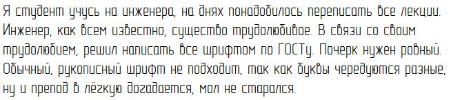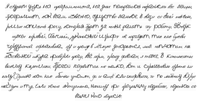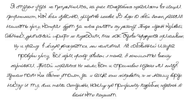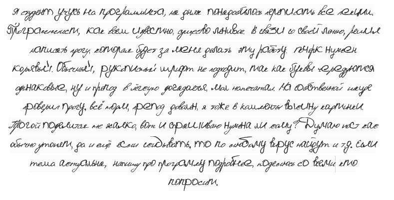 Я студент учусь на программиста, на днях понадобилось переписать все лекции. Программист, как всем известно, существо ленивое. В связи со своей ленью, решил написать прогу, которая будет за меня делать эту работу. Почерк нужен корявый. Обычный, рукописный шрифт не подходит, так как буквы чередуются одинаковые, ну и препод в лёгкую догадается, мол напечатал. На собственной шкуре проверил прогу, всё норм, препод доволен, я тоже. В комменты выкину картинки. Прогой поделится не жалко, вот и спрашиваю нужна ли кому? Думаю пост как обычно утопят, да и ещё если скидывать, то по любому вирус найдут и т.д. Если тема актуальна, напишу про программу подробнее, поделюсь со всеми кто попросит.