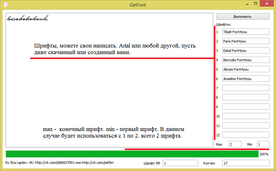 Перед запуском программы установите шрифты, они находятся рядом с exe файлом. Вы можете использовать вообще любые шрифты, их можно вписать справа в программе.