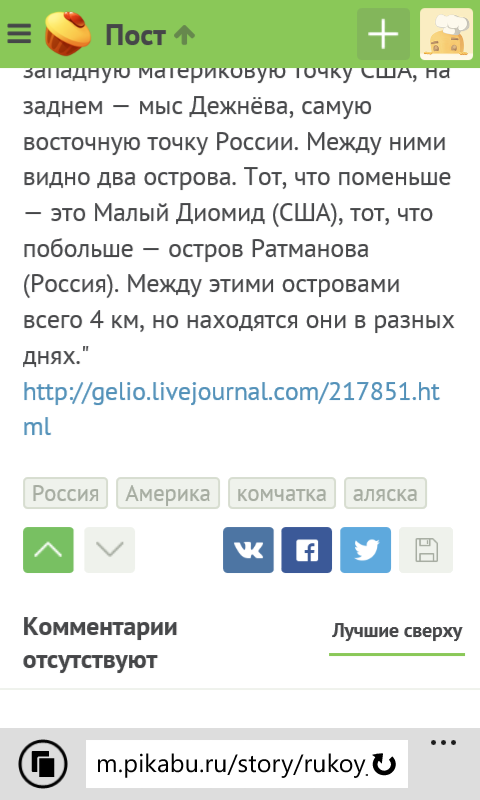 "На переднем плане можно увидеть мыс принца Уэльского, самую западную материковую точку США, на заднем — мыс Дежнёва, самую восточную точку России. Между ними видно два острова. Тот, что поменьше — это Малый Диомид (США), тот, что побольше — остров Ратманова (Россия). Между этими островами всего 4 км, но находятся они в разных днях." http://gelio.livejournal.com/217851.html