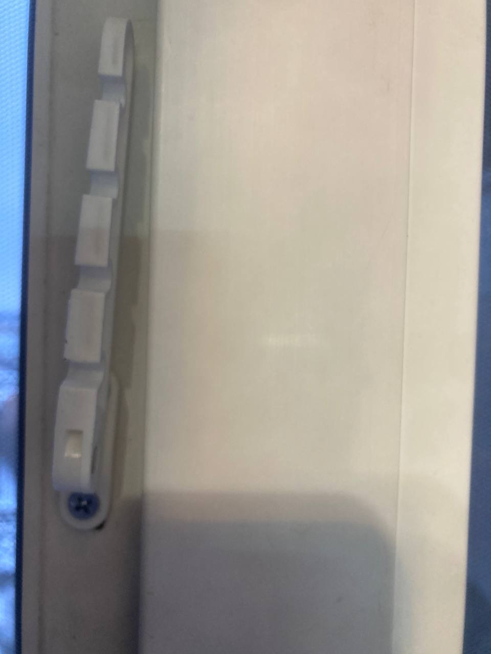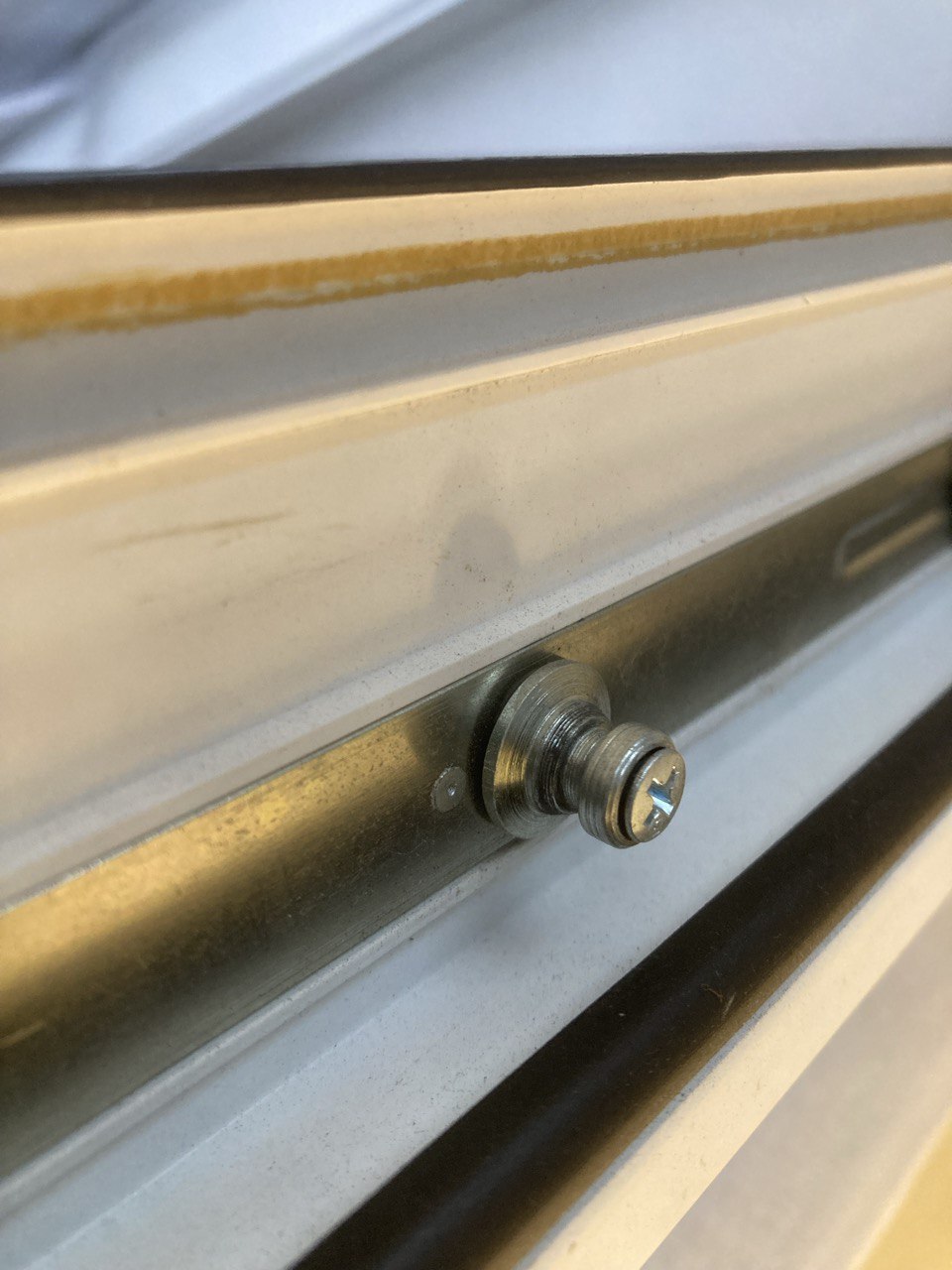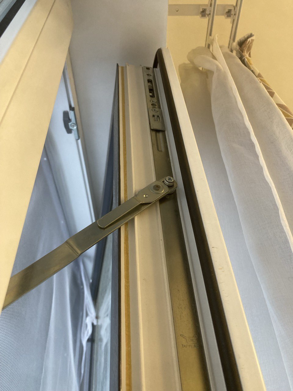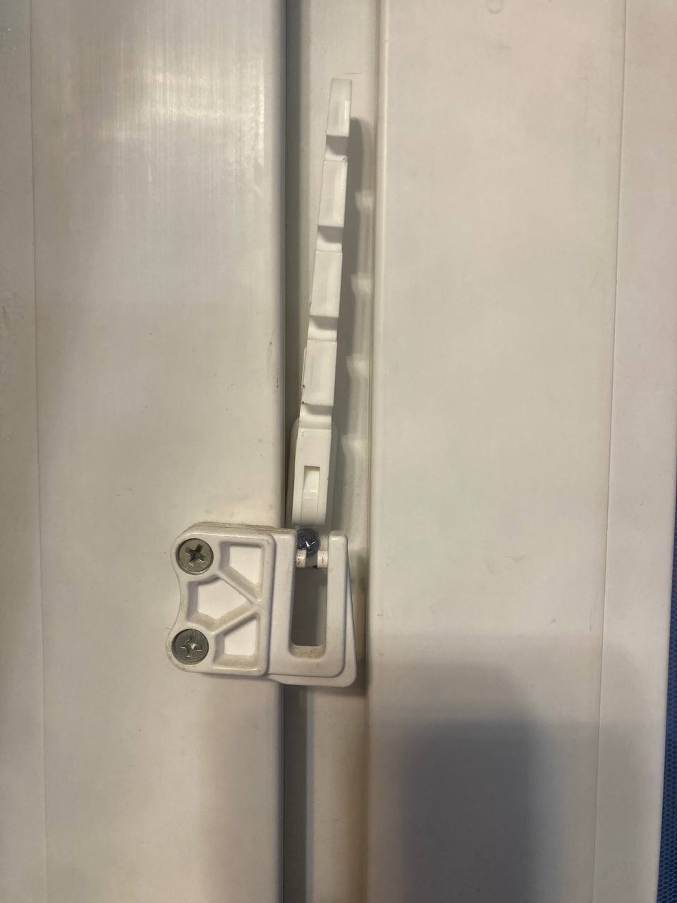 Добрался этот изобрететельный человек до детских блокираторов на окна! Такая пластинка, соединяющая раму и створку, чтобы детей не искушать. Снимается и одевается, путем поворота флажка, и снятия с хитрой железной втулки в форме катушечки.