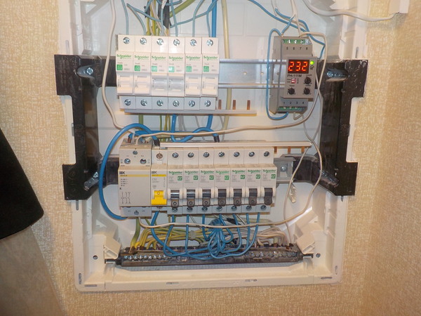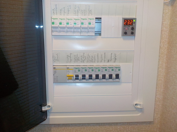 Убираем входное УЗО (рубильник внизу слева) и на его место лепим контактор, реле напряжения ставим так, чтобы не мешало.