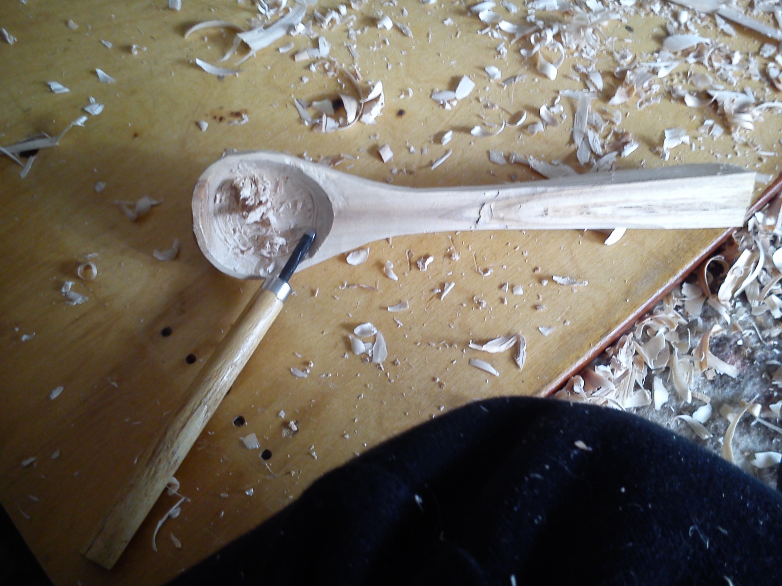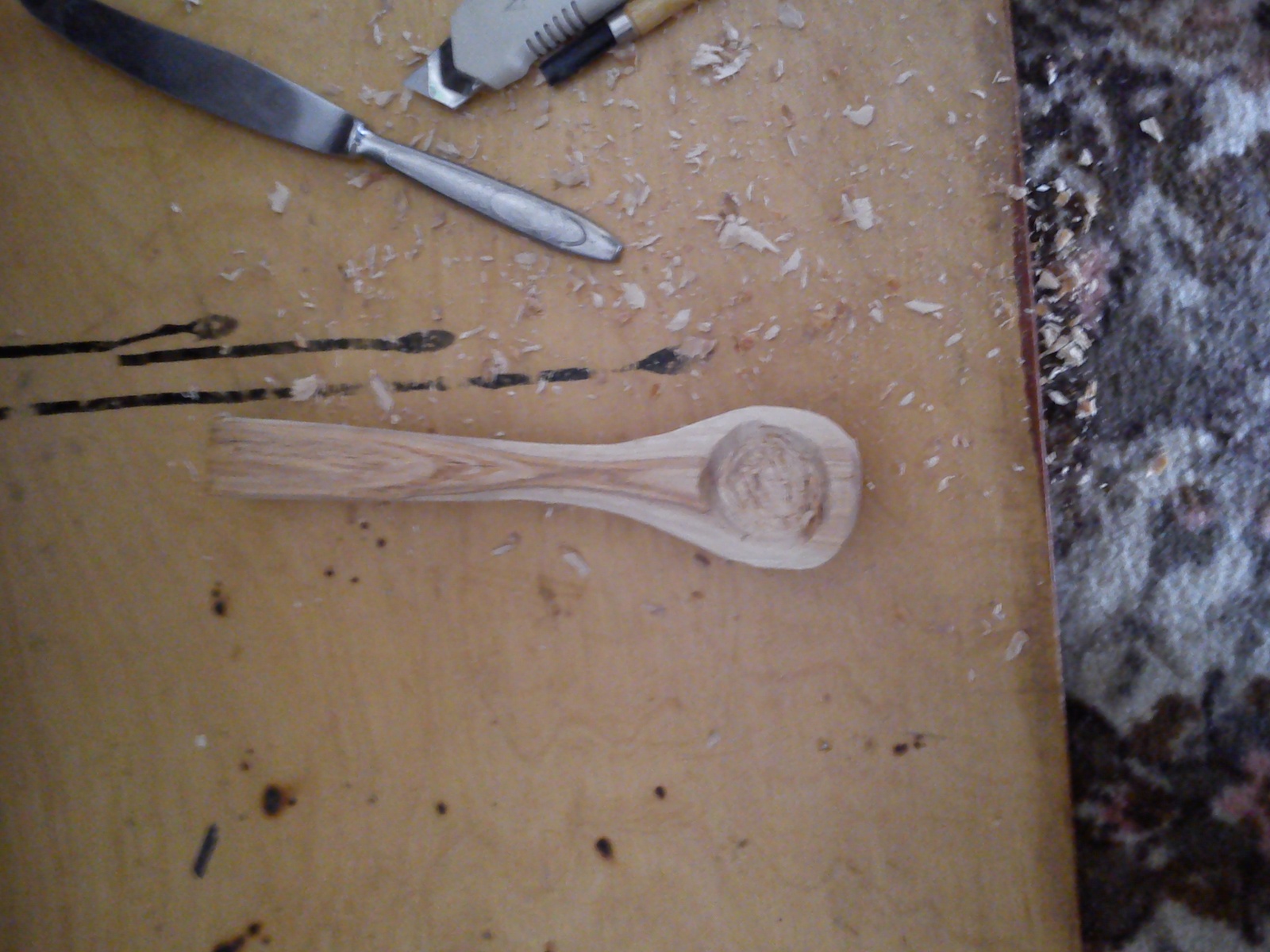 Ковер, опилки стружка. Ложку еле видно.