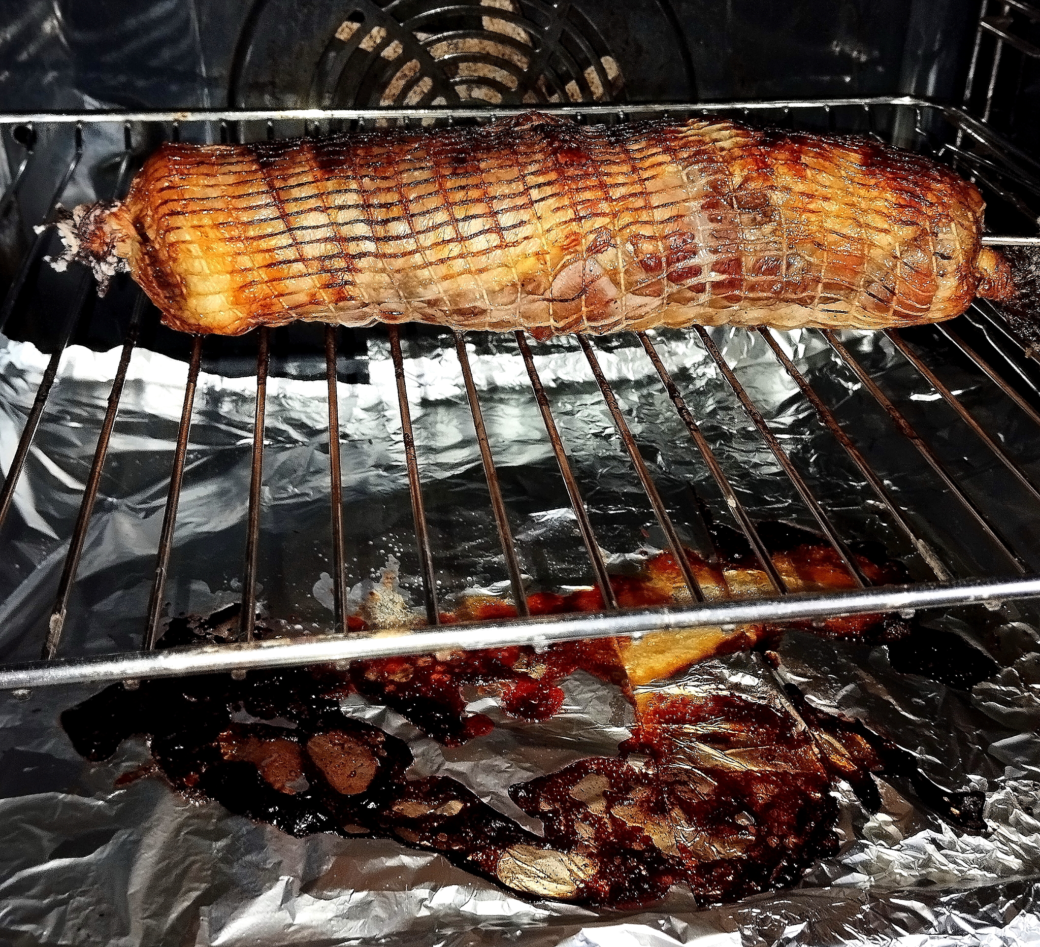 1. этап при выставленных 80-90 в духовке довести до 72 по щупу в теле рулета (стремимся к 3 часам), поворачивал. Нагрев шкафа режим: вверх и низ. Рулет на решетке, нижний противень укутываю в фольгу, чтобы далее уменьшить трудоемкость процесса отмывания.