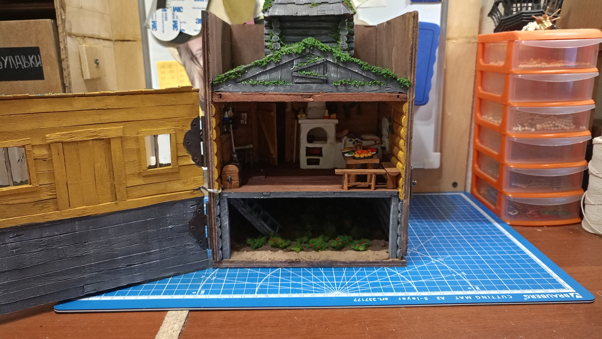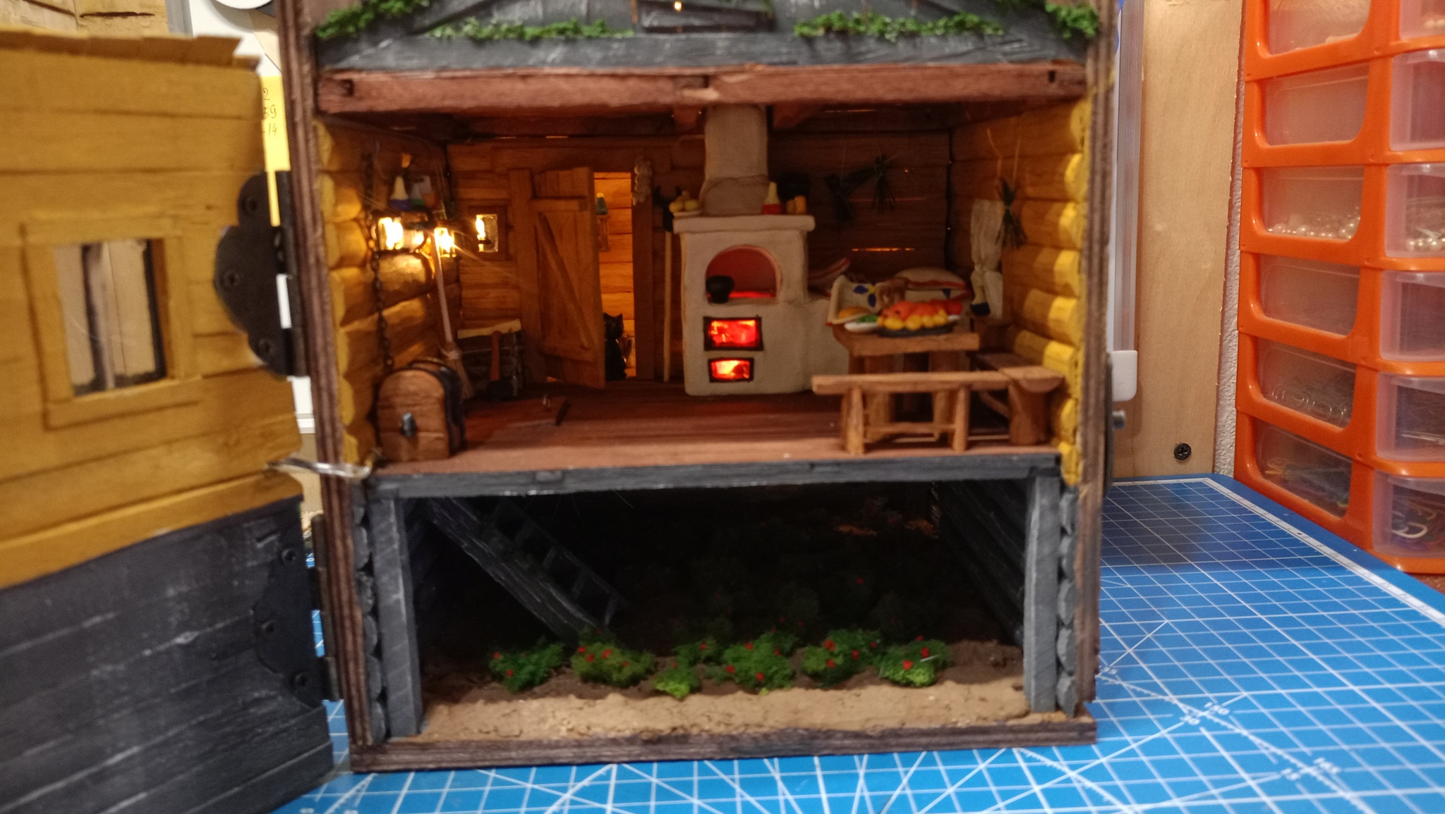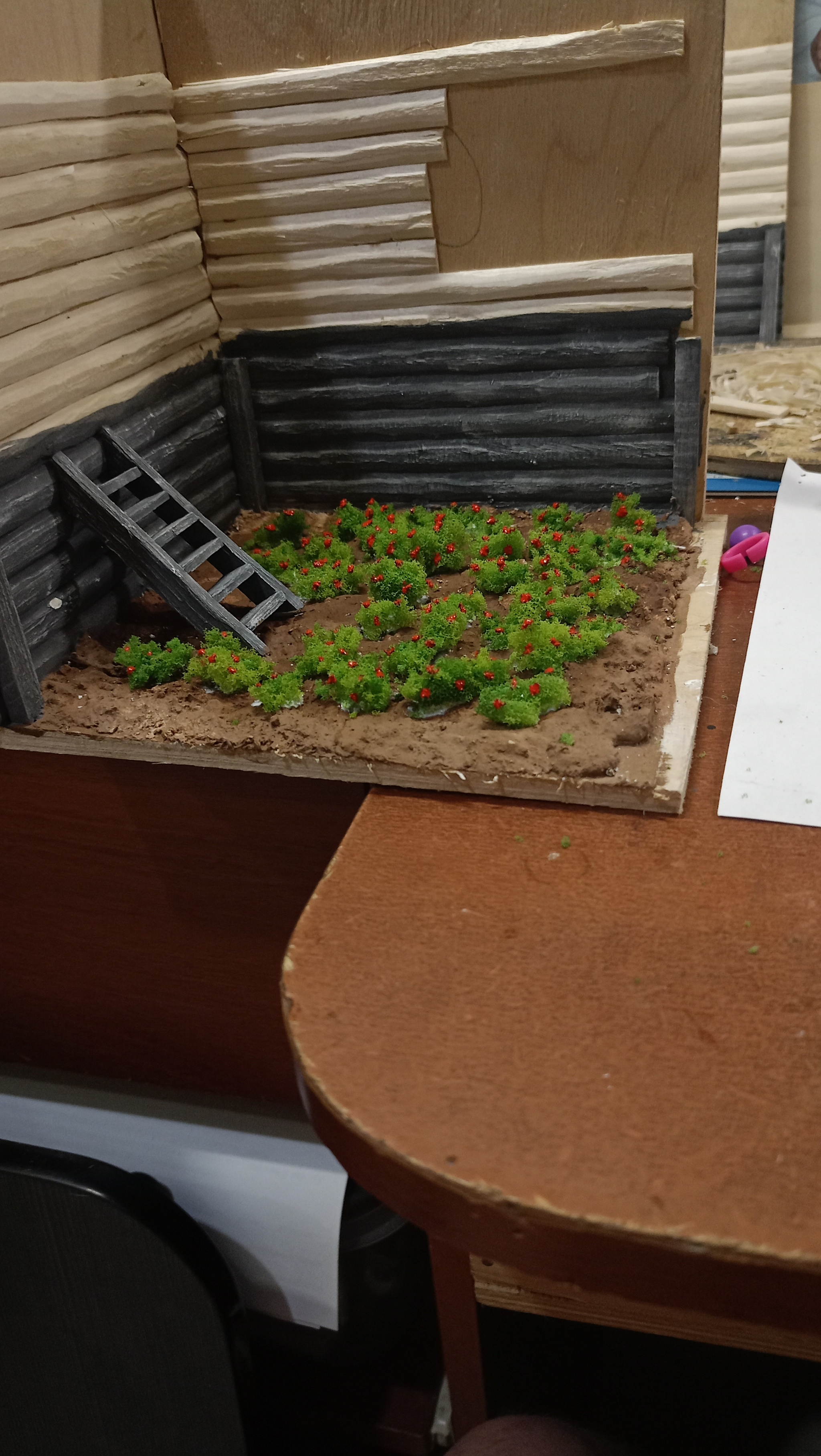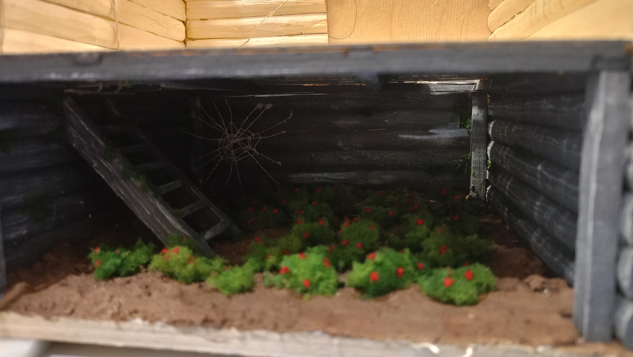 Нижний уровень. Тут подвал с клубникой. Грунт делал из смеси гипса, пва и опилок. Затем покраска. Кусты из крашенного паралона.