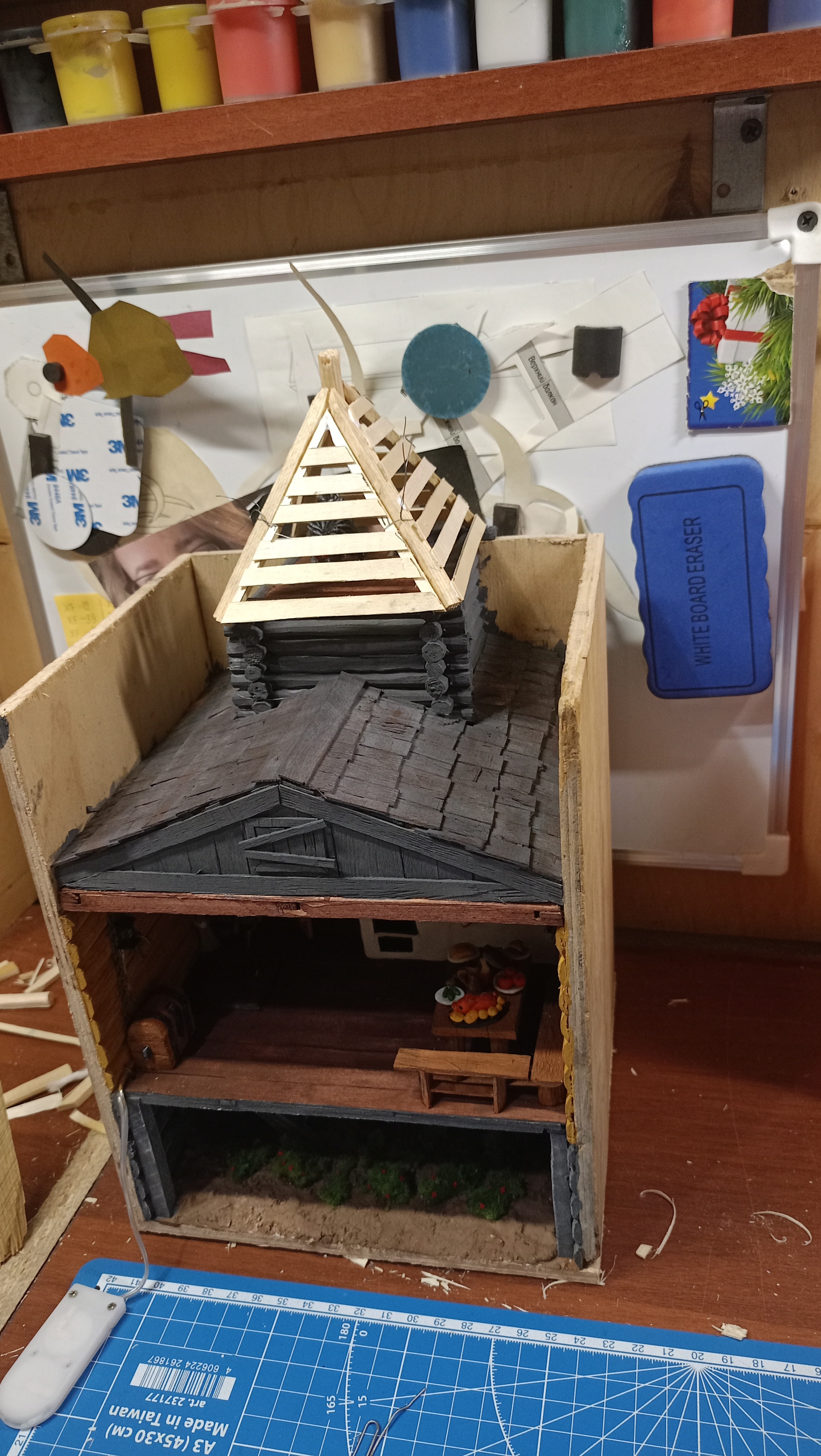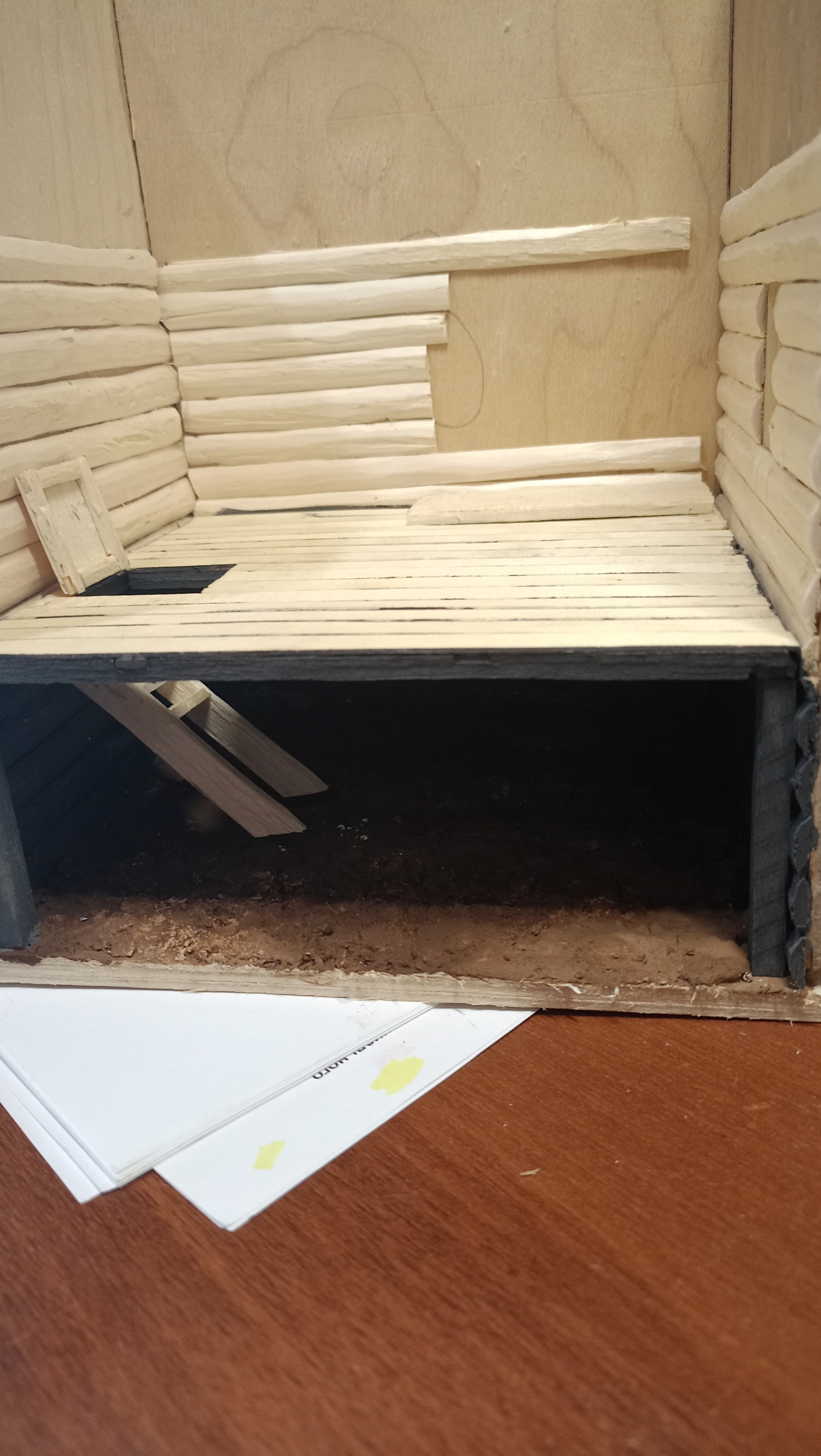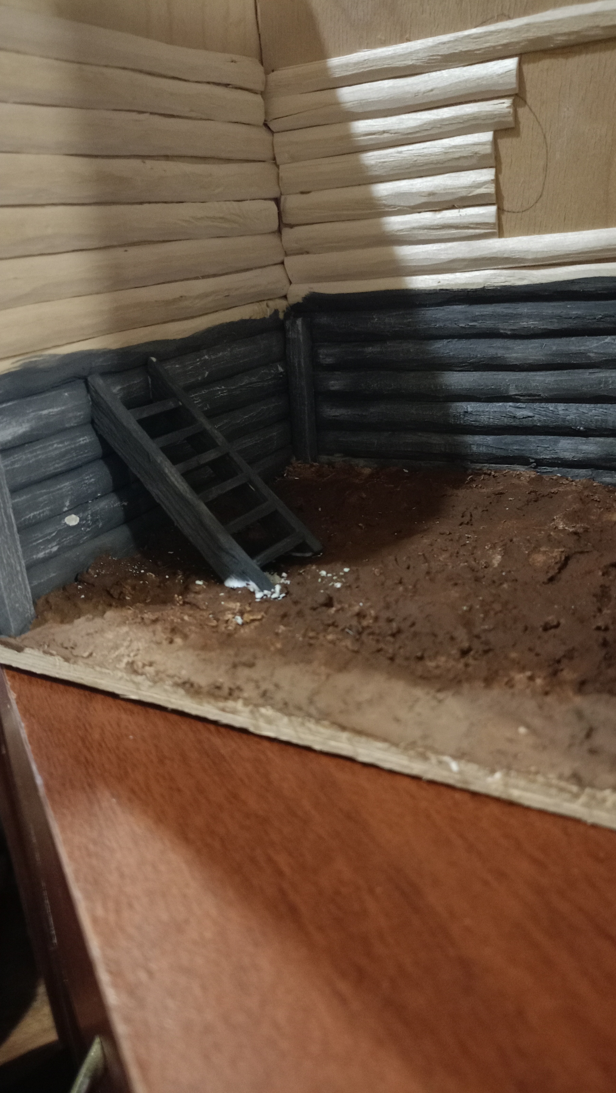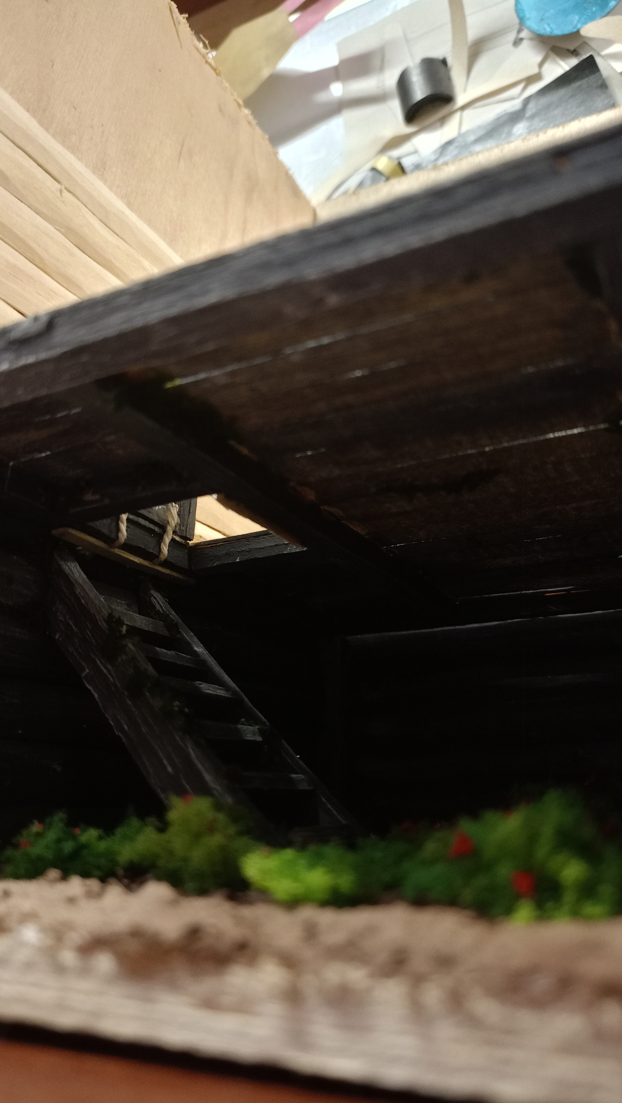 Нижний уровень. Тут подвал с клубникой. Грунт делал из смеси гипса, пва и опилок. Затем покраска. Кусты из крашенного паралона.