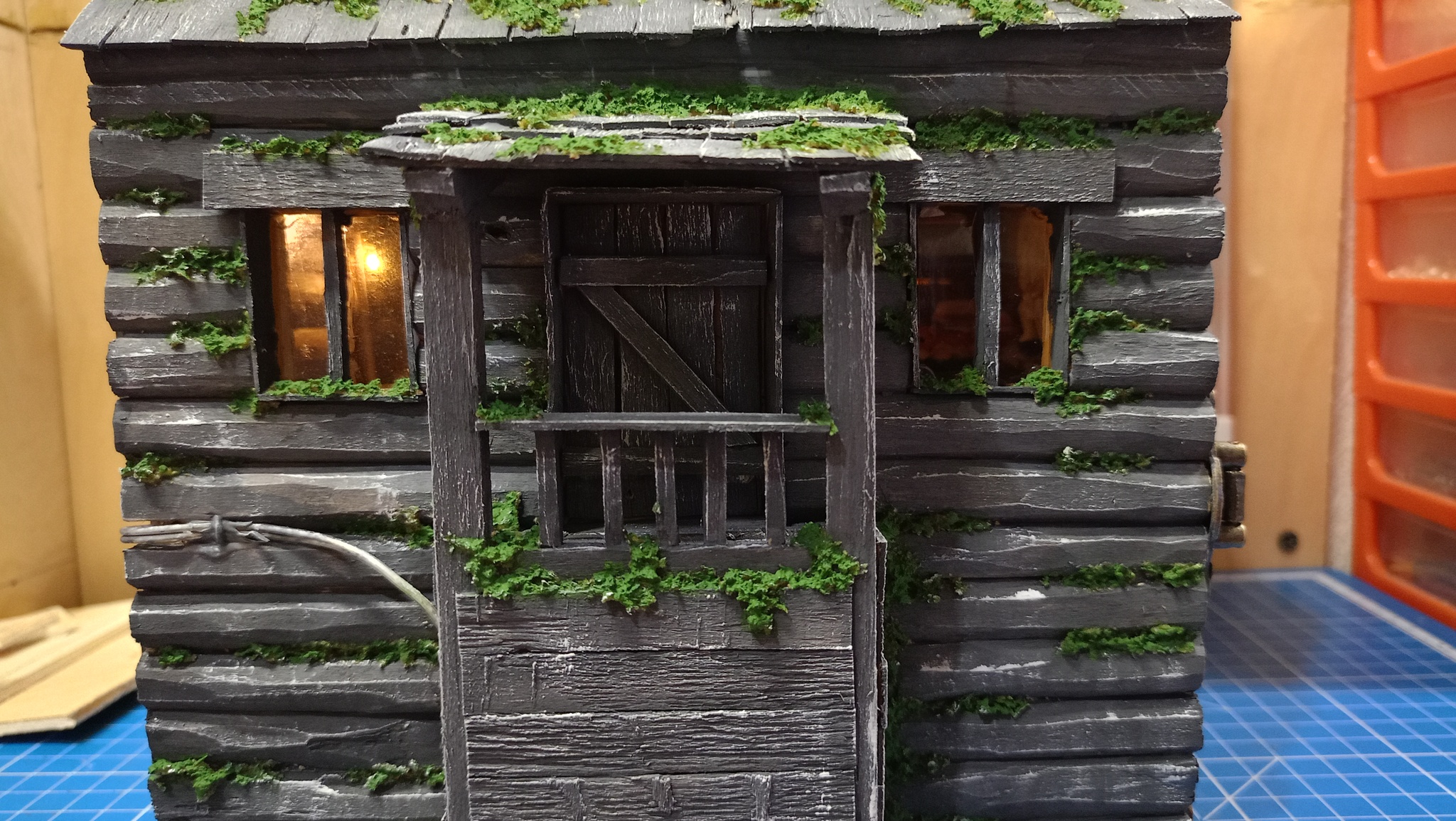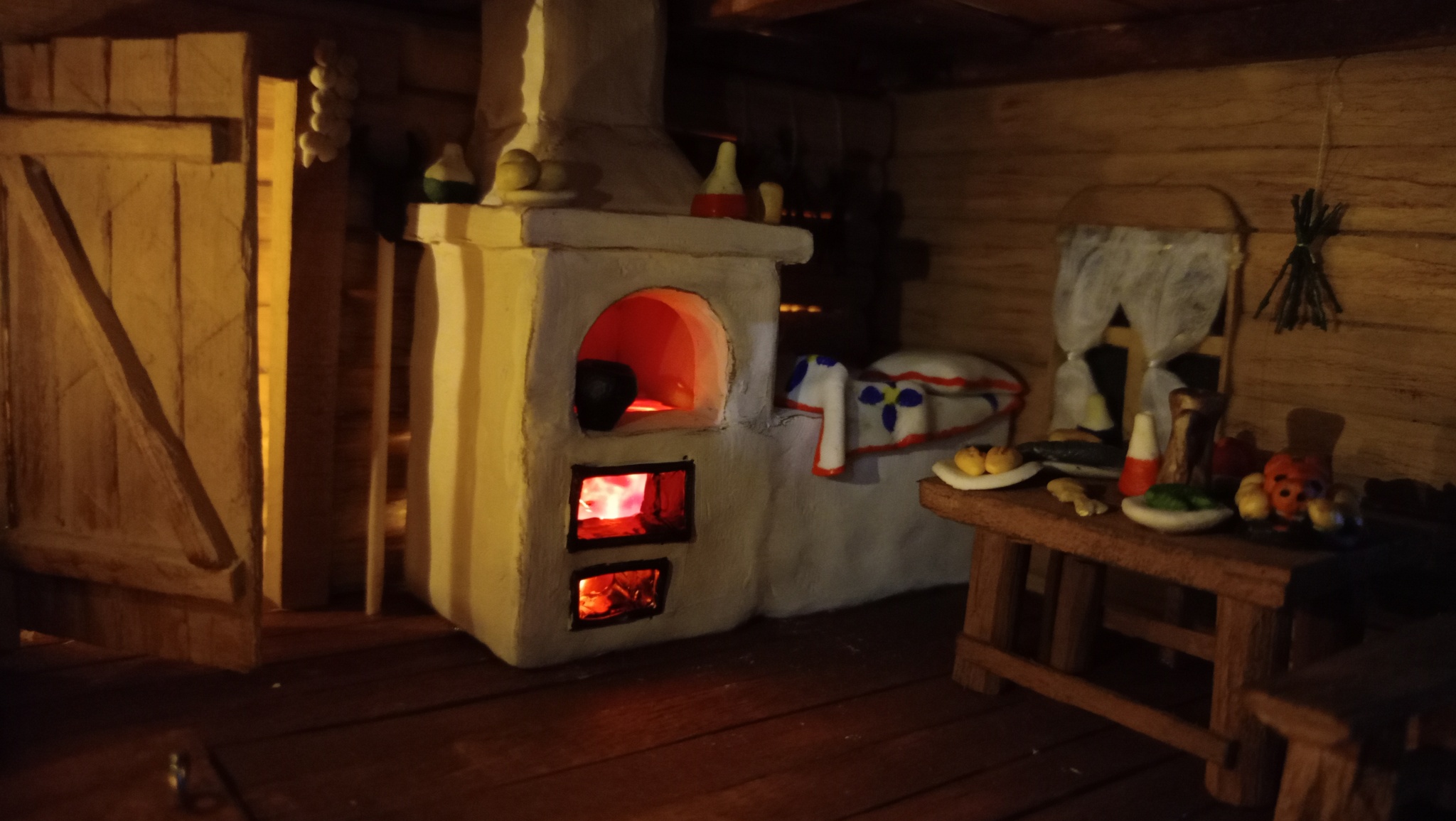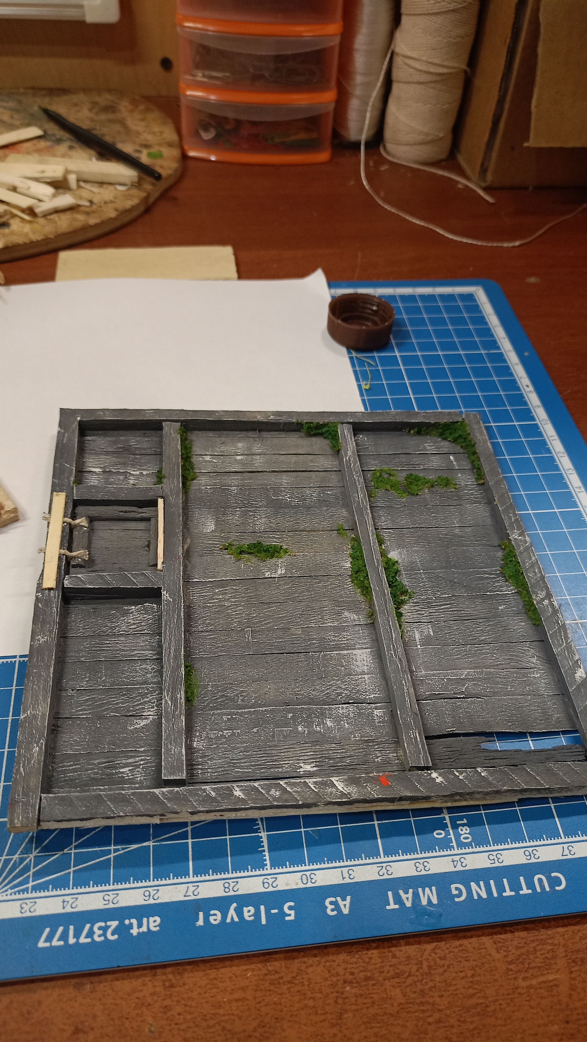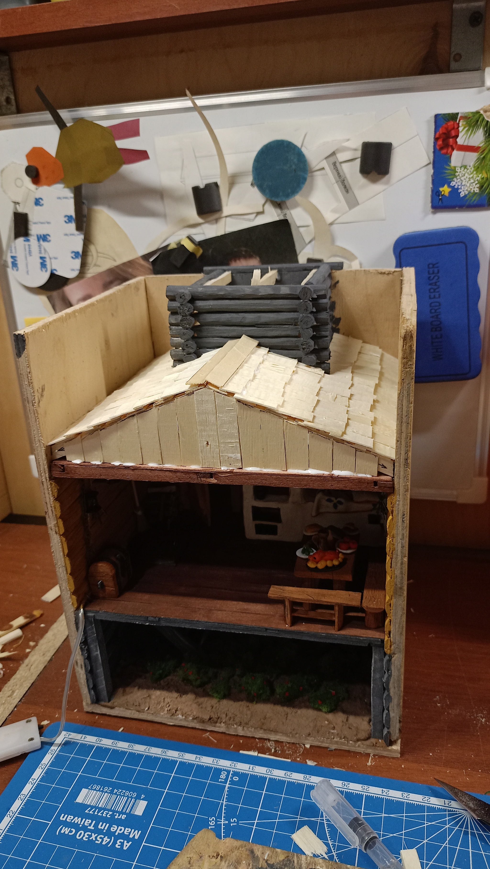 Нижний уровень. Тут подвал с клубникой. Грунт делал из смеси гипса, пва и опилок. Затем покраска. Кусты из крашенного паралона.