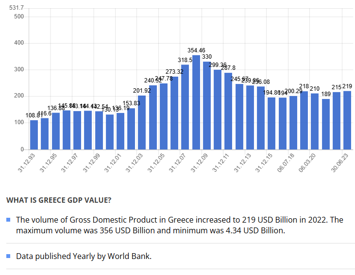 Греция стала именем нарицательным, и было за что. Они были в крысисе, и 20 лет назад, и 10 лет назад. Сейчас же не в Греции дела лучше стали, это в мире дела пошли хуже настолько, что Греция уже не кажется пиздецом. На картиночке Greece GDP Value & Rate 2025 Per capita по данным мирового банка.