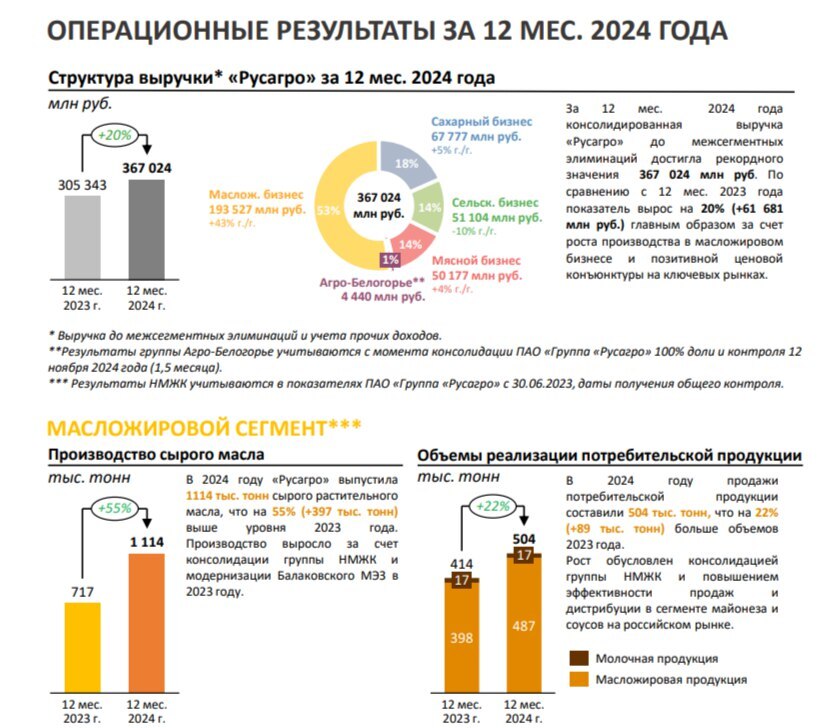 Последний отчёт Русагро выглядит оптимистичным — производство растет, в основном за счёт масложировой продукции, которая давно отодвинула сахарный бизнес на второе место. Сложности с урожайностью в 2024 году из-за неблагоприятных погодных условий оказали очень умеренное влияние на компанию.