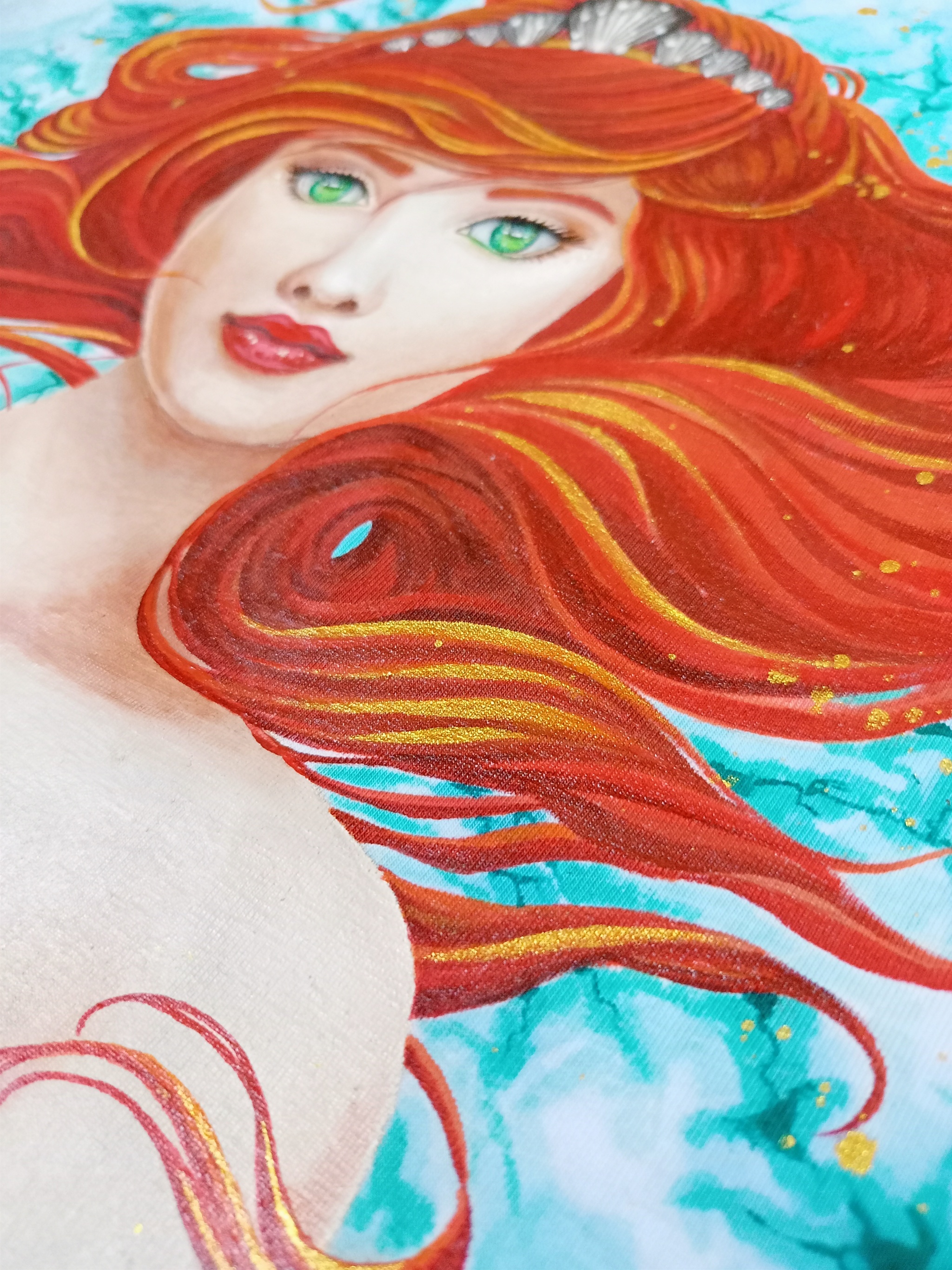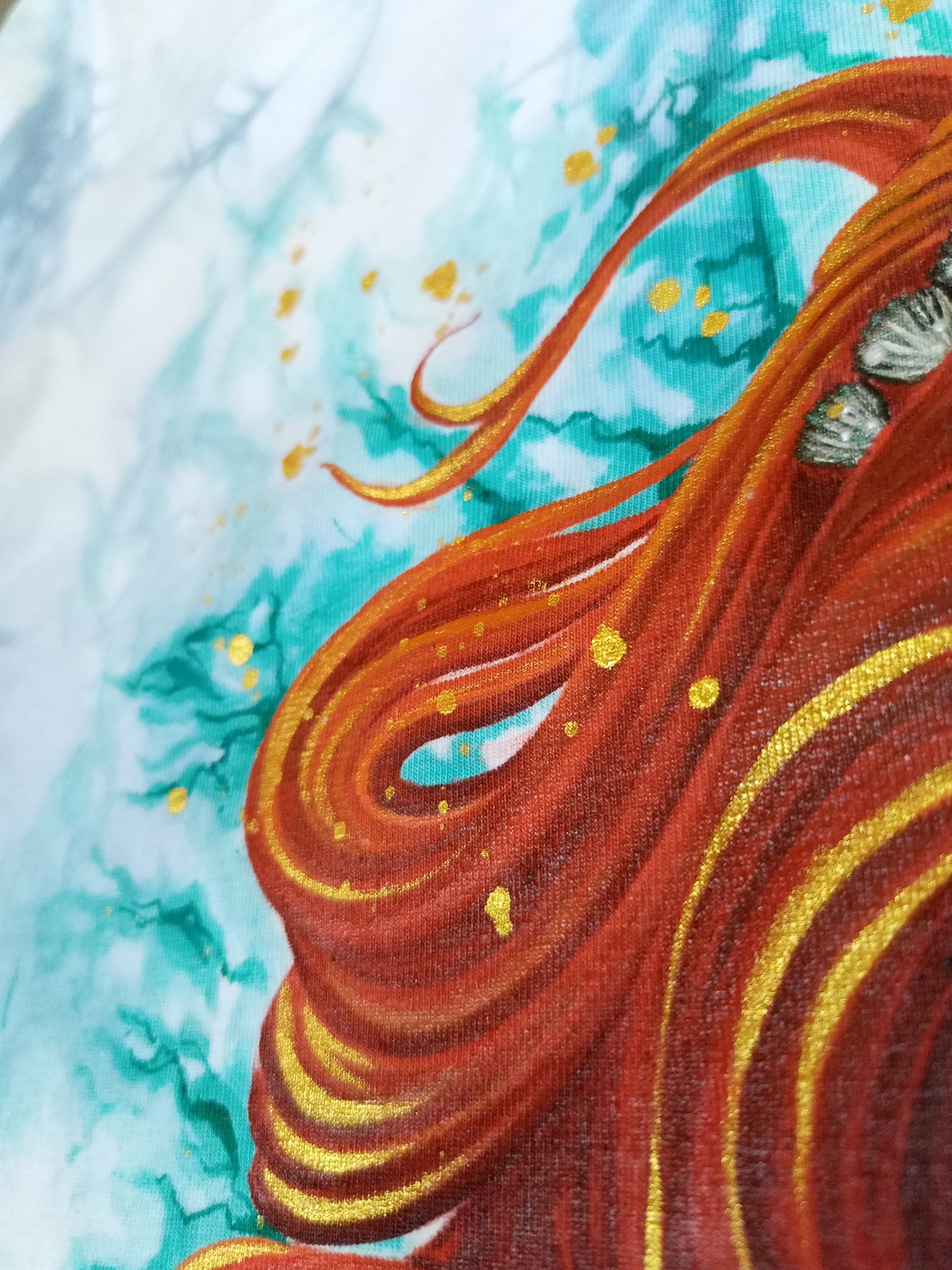 Все началось с футболки. Ее узор, выполненный с помощью тай-дай, напомнил море. Так и появилась идея нарисовать русалку. Эдакую Ариэль.