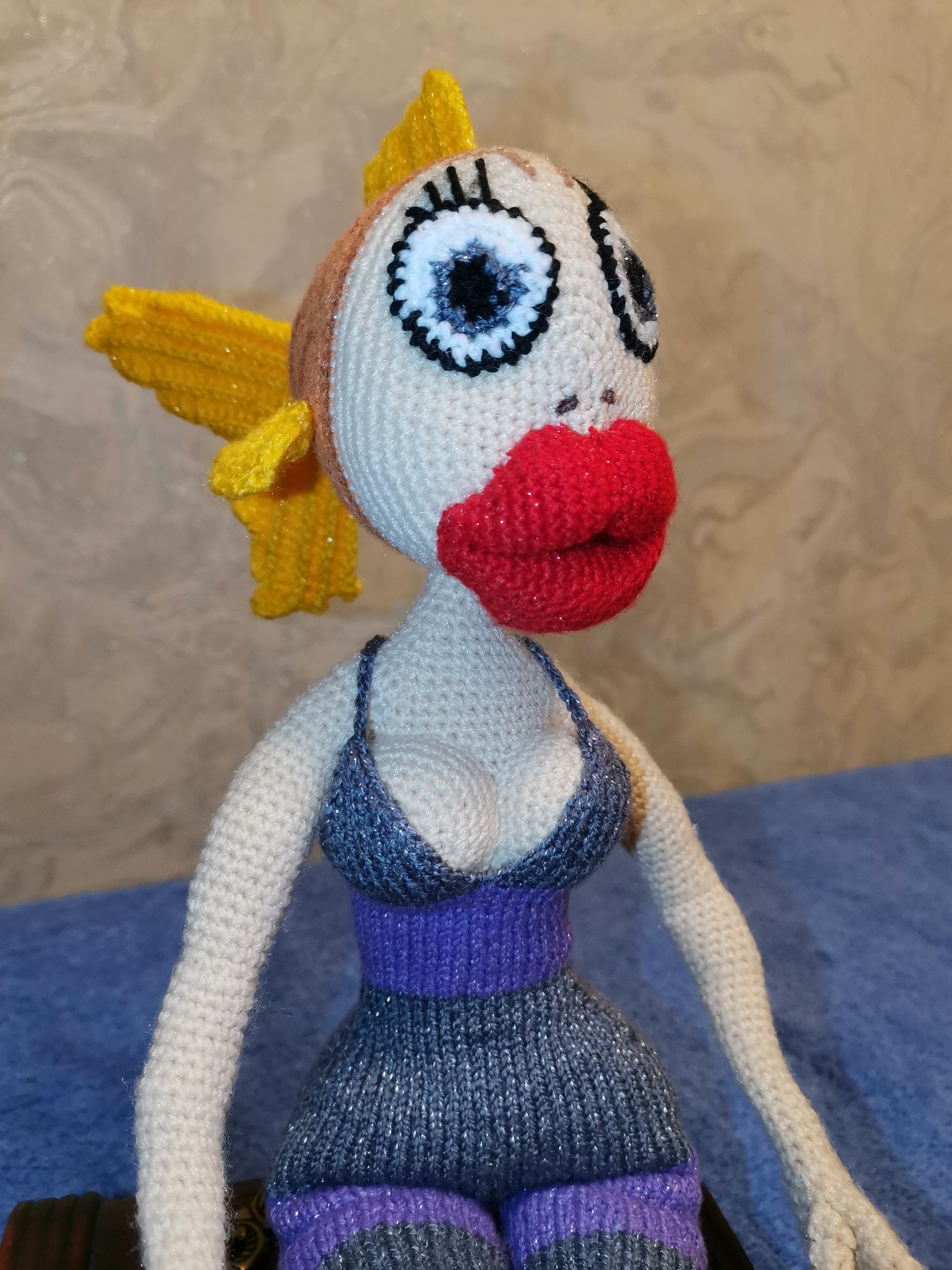 Год назад, когда кипиша по поводу "правильных" русалок даже и не намечалось, попросил меня муж связать ему русалку с сиськами. Ну ладно, с сиськами, так с сиськами... Сначала предложила ему в качестве образца русалку из "Богатырей". Сказал, что слишком жирная. Долго припоминала всех русалок, но в основном у них сиськи были не очень... А потом вспомнила настоящую армянскую русалку (муж наполовину армянин). Продумала образ, закупила ниток и... отложила все это нафиг на целый год. Летом вспомнила, что надо бы порадовать мужа и начала ковырять отложенные ниточки крючком. Работы на работе было много, перерывов на вязание было мало... Когда что-то наковыряла, пришел черед ненавистных мне спиц. Еле-еле успела доделать русалку ко дню рождения мужа. Кипишь вокруг русалок начался где-то в середине моего вязания русалки. Накаркала, наверное...