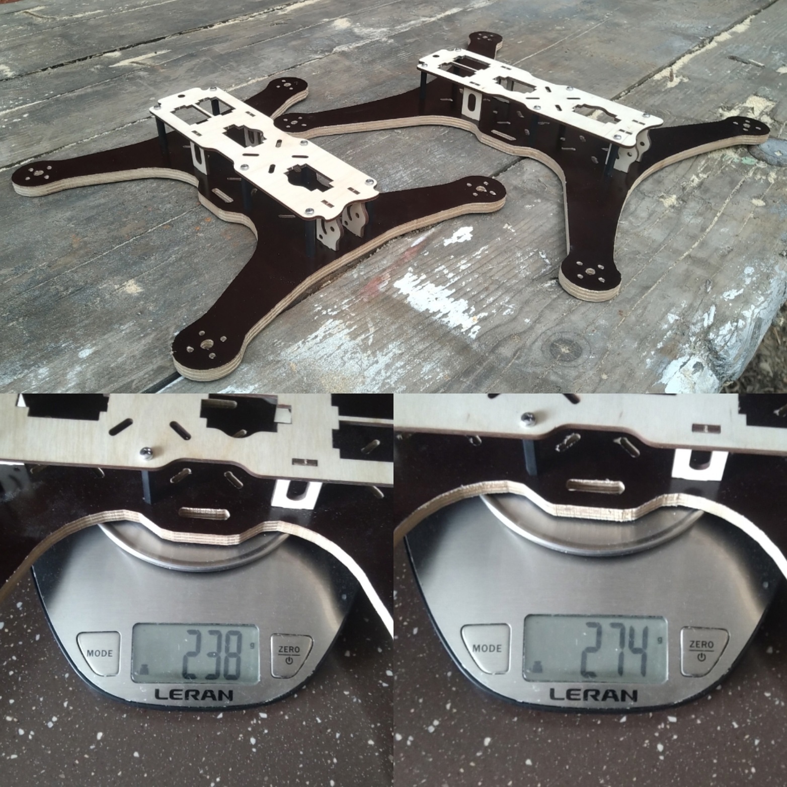 Первые же полётные испытания показали, что конструкция удачная. Фанера гасила паразитные вибрации, и не требовались дополнительные настройки программного нивелирования вибраций. Испытания семидюймового дрона с нагрузкой в виде полуторалитровой бутылки с минеральной водой тоже прошли успешно.