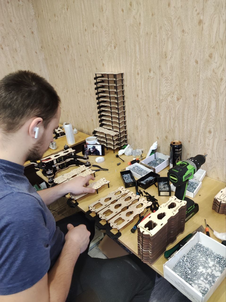 Было решено запускать производство рам в серию. К этому моменту на фронте начали появляться трофейные детали с упавших и не взорвавшихся вражеских поломанных квадрокоптеров, и наличие фанерной рамы дало возможность пересобирать дроны и отправлять их обратно.