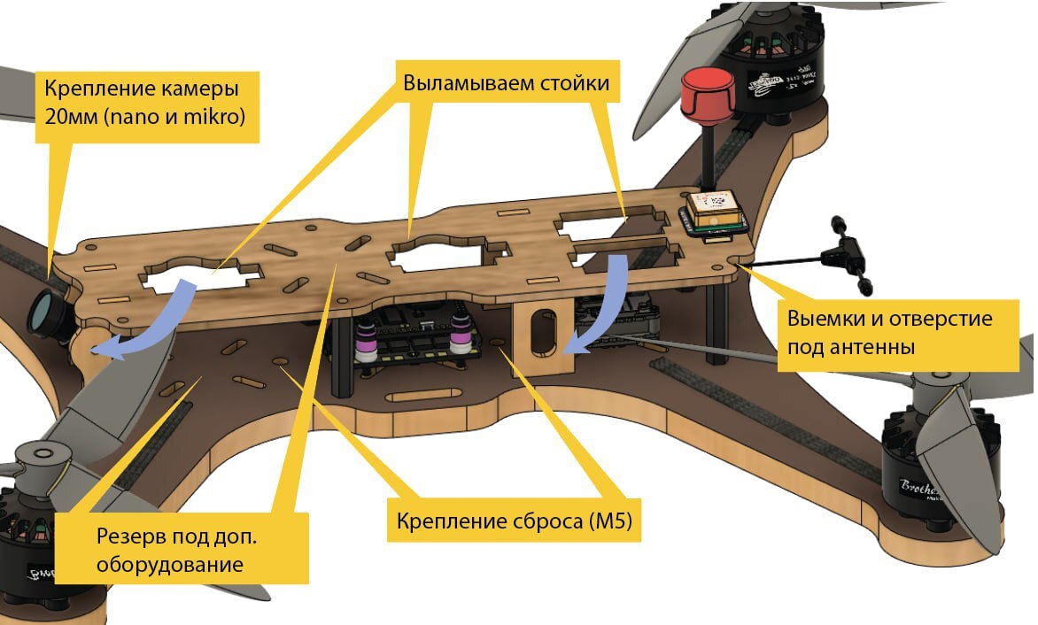 Поэтому основная часть дрона представляет собой просто одну деталь, что упрощает и значительно ускоряет процесс сборки квадрокоптера». Конструкция рамы представляла собой цельную фанерную пластину с вырезами для установки компонентов. Дополнительная верхняя фанерная пластина служила площадкой для аккумуляторной батареи и для установки курсовой камеры с помощью выламываемых из неё же вертикальных стоек.
