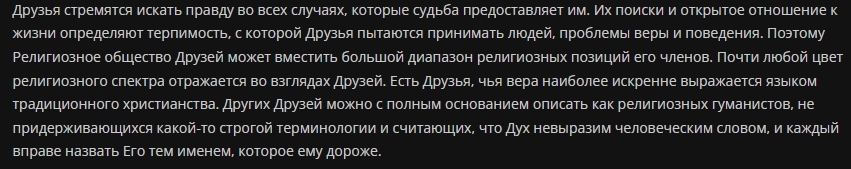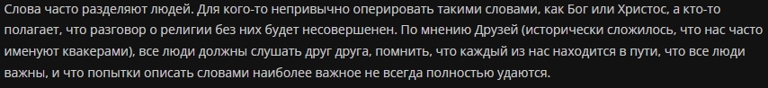 И тут видим упоминание некого Божественного Духа и высшего духовного роста. Пока не ясно о чём речь... Далее идёт некий духовный рост. Этот термин встречается в некоторых (почти во всех) восточных учениях, эзотерических, ведических и даже некоторых магических учениях. И везде это понятие размыто так, что понять его практически невозможно. Есть нечто похожее и в православии под уже известным названием "духовность". Далее они рассуждают о своём отношении ко всей человеческой жизни. И тут упоминается некий бог. Пока не ясно кто или что это. Ладно. И здесь фото квакерского собрания: