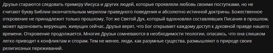 Здесь говорится об отсутствии какой-либо доктрины квакеров. Очень похоже на некоторые субкультуры. Далее сообщают о своей сущности. Это некий живой опыт. Что это пока не ясно. Далее говорят о неком своём образе жизни. И опять не ясно что это. И далее говорят о постоянной помощи бога всем людям. В православии же бога надо постоянно просить о помощи, сам он помочь не догадывается. И в конце признают, что все логические рассуждения богословия мало кого могут убедить в существовании бога. А может проблема в изначальном отсутствии какой-либо логики в этих рассуждениях? И заканчивают этот абзац словами о каком-то переживании бога в своей душе. Ну, об этом говорят все христианские учения. И не дают никакого внятного определения этого переживания. В следующем абзаце видим уже известное бла-бла-бла про любовь и пример Иисуса: