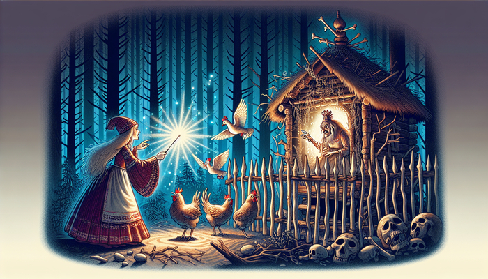 А теперь перенесёмся в русскую сказку. Где разворачивается действие? В лесу. На болоте. В избушке на курьих ножках. Лес — это не просто фон, это живой персонаж, полон чудес, опасностей и испытаний.