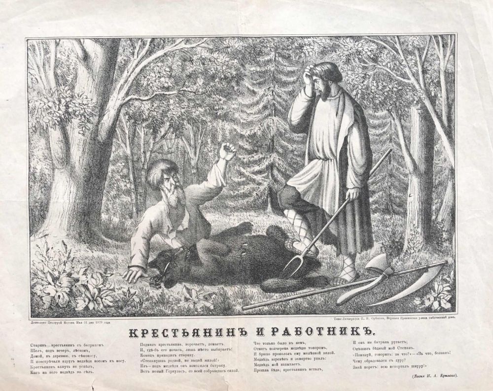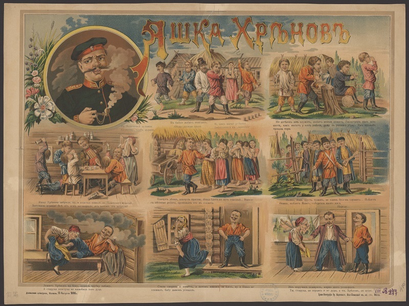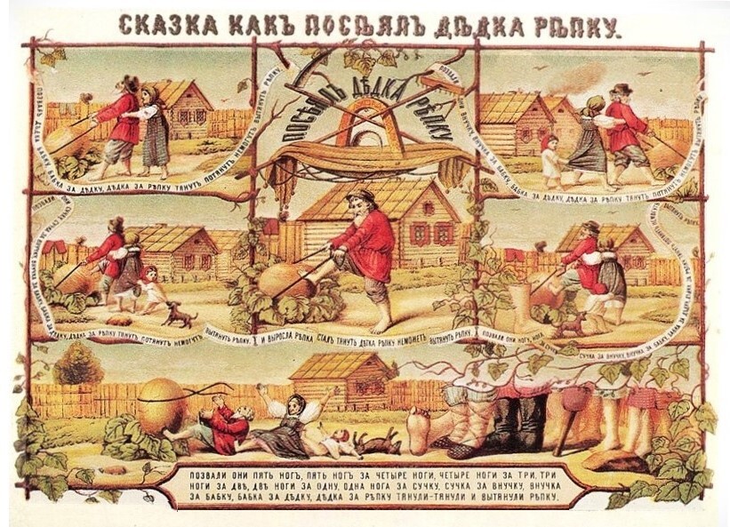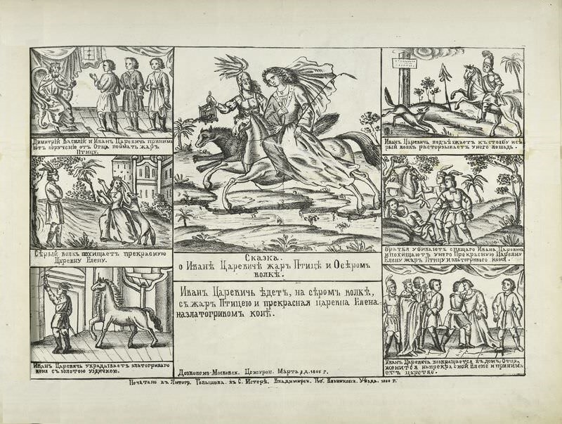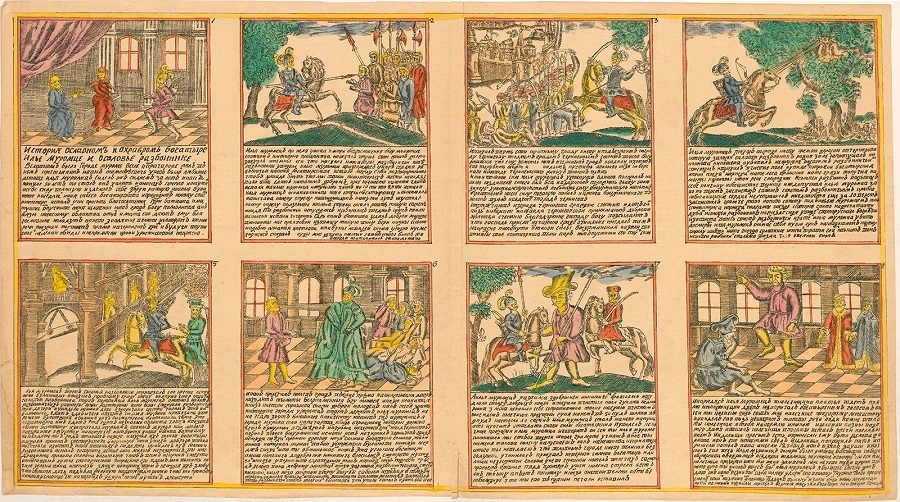 В народе ходили так называемые лицевые сказки: лубочные картинки делили на восемь или 16 фрагментов и печатали на одном листе, который потом разрезали. Страницы сшивали в определенном порядке, получалась небольшая книжица, удобная для чтения.