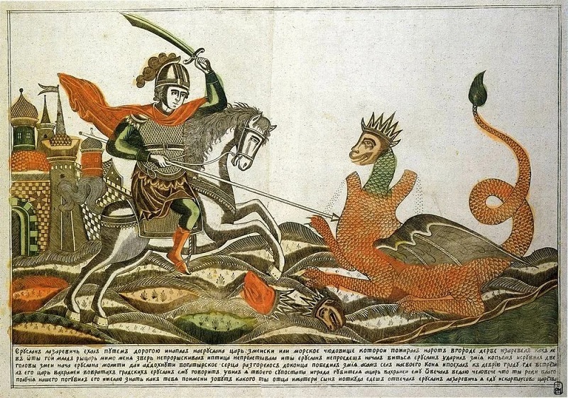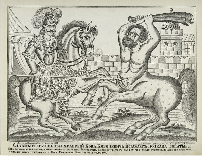 Главными их героями были Бова-королевич и Иван-царевич, Илья Муромец, сражающийся с Соловьем-разбойником, легендарный герой Еруслан Лазаревич, поражающий морское чудовище, и другие сказочные храбрецы.