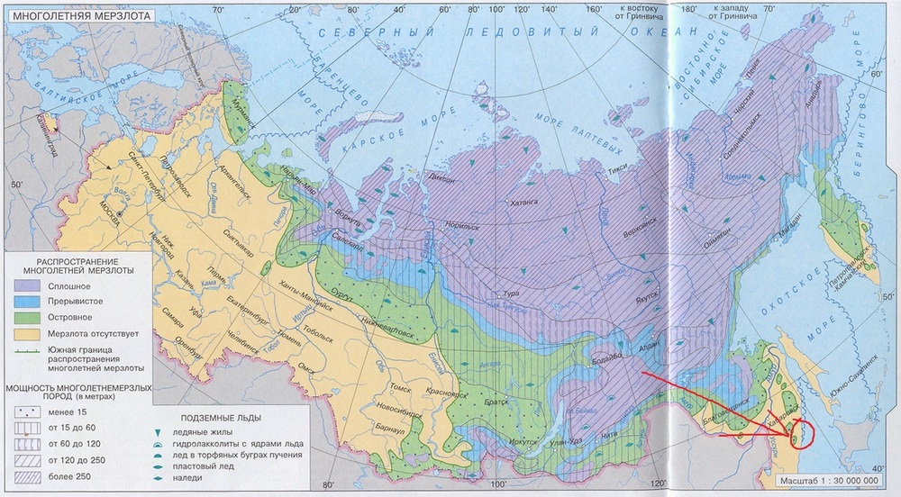 А теперь внимание на карту распределения вечной мерзлоты в Охотском (которое указано в посте) море...
