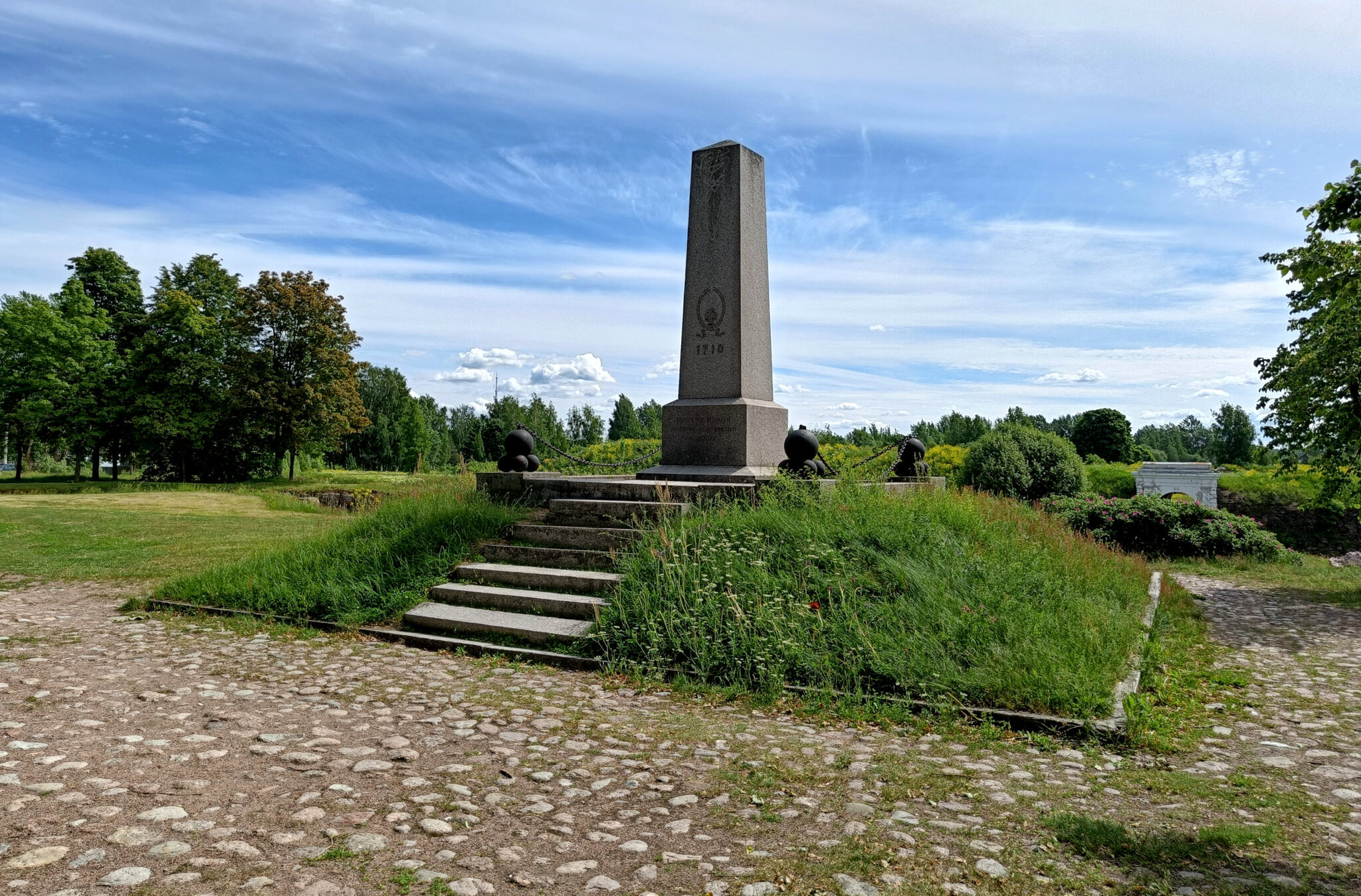 Хотя стоп, не пережил. Памятник, возведённый над братской могилой воинов петровской эпохи, был таки благородными финнами уничтожен. Воссоздали его по историческому образцу только в 1994 году. Надпись на обелиске ниже даты «1710» гласит: «Русским воинам, павшим при взятии Выборга». Рядом в 2001 году похоронили найденные при раскопках в Выборге останки петровских солдат, чему посвящена отдельная памятная плита. Плита сделана так качественно, что надпись на ней выцвела и стёрлась за 20 с лишним лет и едва читаема, так что фотографировать её бесполезно.