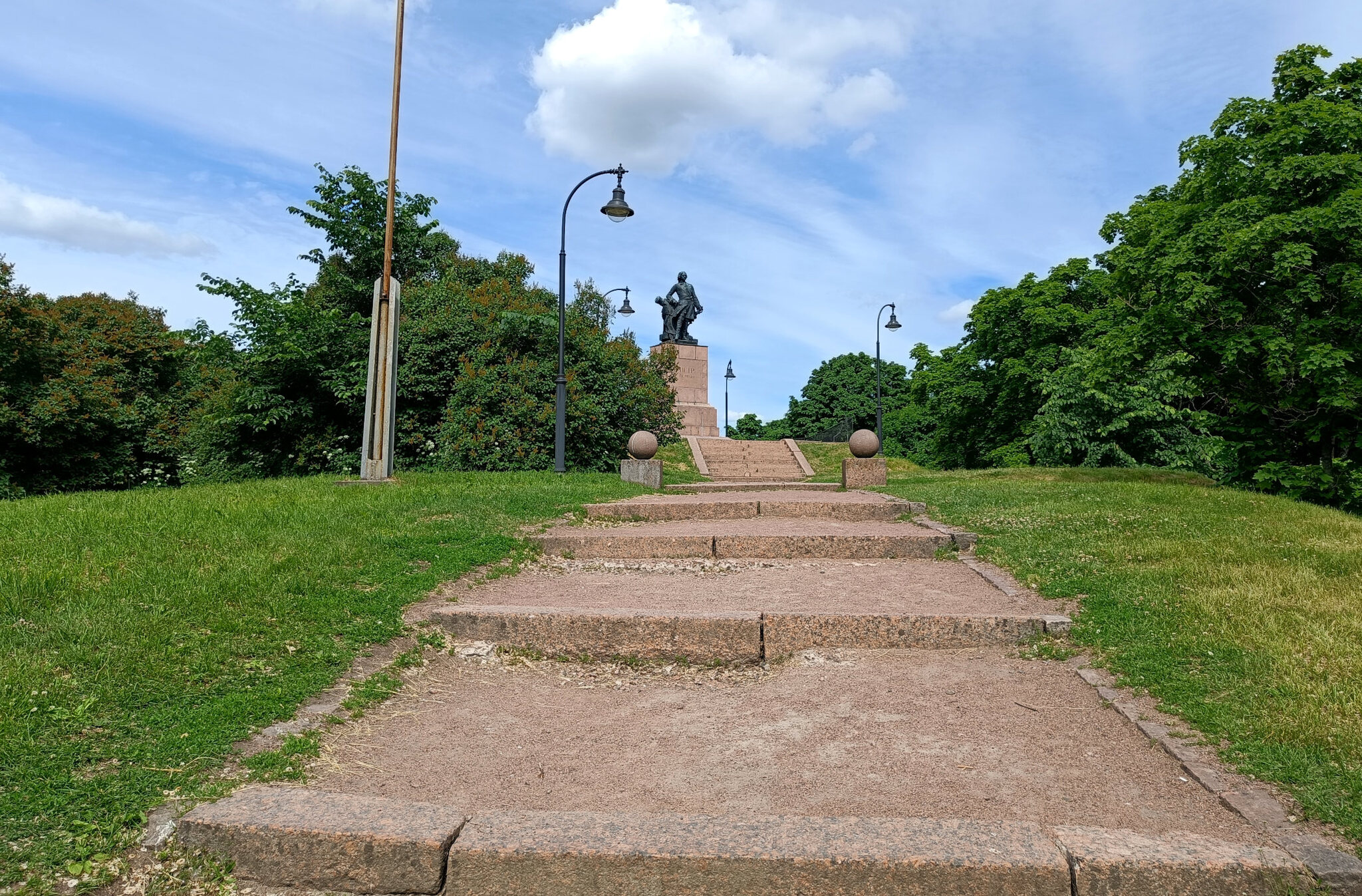 Памятник, как и обелиск русским воинам, появился в Выборге в 1910 году. Изначально на этой горе хотели построить православный военный Петропавловский собор, всё-таки в городе дислоцировались русские войска, а памятник как бы предполагался в дополнение к храму. Но храм не достроили, а памятник снесли сами знаете кто. Однако монумент, пусть финны и думали так сделать, не отправился на переплавку. Он сохранился в местном музее, откуда его торжественно вытащила советская власть.