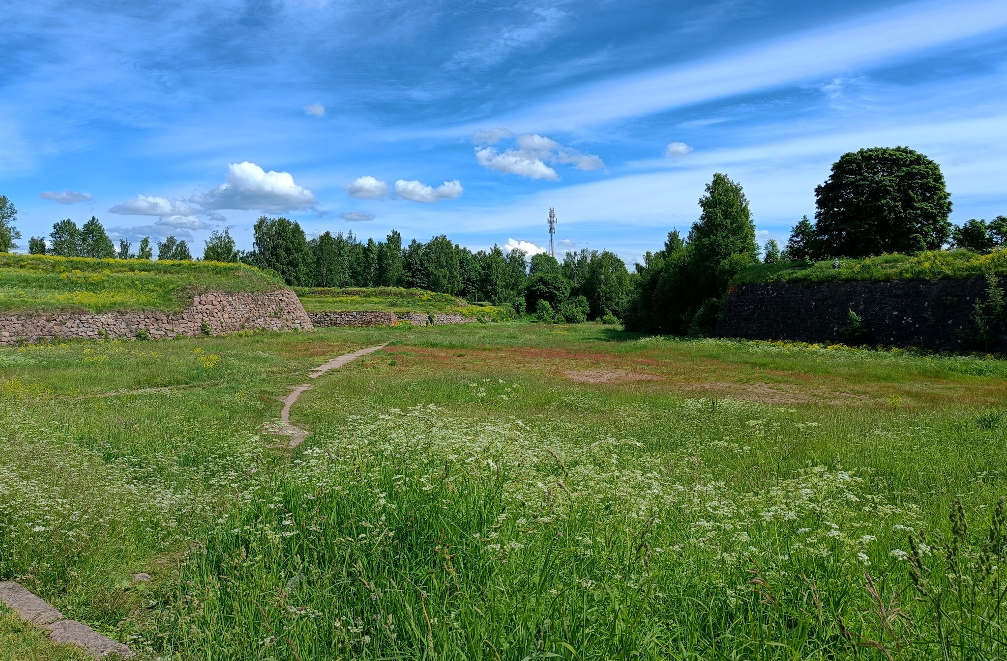 Так выглядят укрепления сегодня. Заросли травой, но, кажется, что относительно прилично сохранились. Специалисты говорят, что местами всё очень плохо, состояние аварийное, иногда поступают новости, что та или иная стена обрушается. В 2021 году председатель комитета по сохранению культурного наследия в Ленинградской области Владимир Цой высказывал мнение, что, мол, без проблем бы мы всё реставрировали вовремя, но Аннинские укрепления в федеральной собственности, у нас руки связаны. А центральные власти поди спроси.