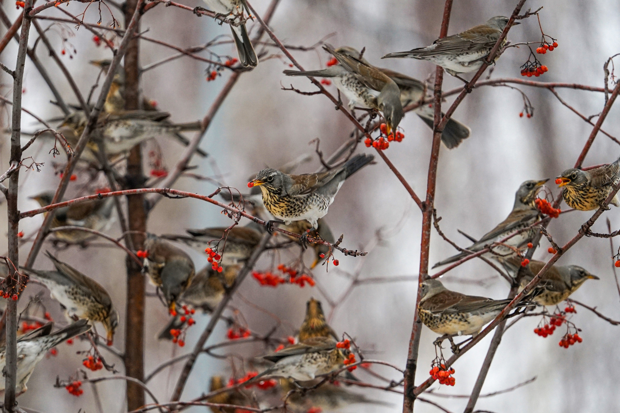 Обычно в нашем районе их много зимой. У меня они жрут примерно все, начиная от ягод в июне, заканчивая червями из компостных ям и поздних ягод и яблок, а глубокой осенью и зимой прилетают объедать городскую затройку. В этом году нет никто, остались слетки, котррых оставили выживать. Иесли брать прошлые года тут у нас было по 40-50 рябинников разом и по 20-30 черных дроздов, то в этом году урожай и погода сделали свое дело. Два рябинника, четыре черных)) куча еды которые никому не нужны)