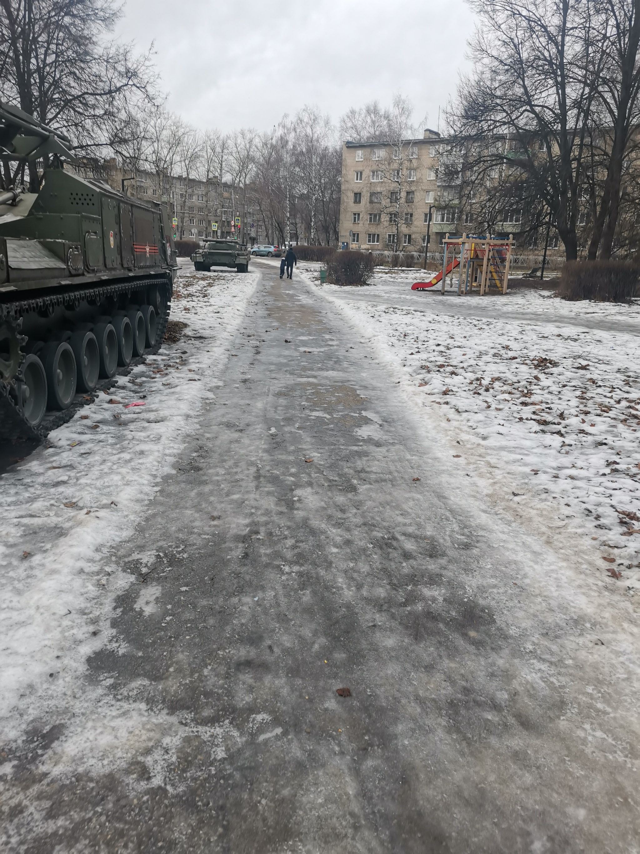 Разве трудно технику поставить на "пеньки" , что бы колеса не были спущенные? Наклейки оторваны, машина повреждена, на самом памятнике отсутствуют гранитные плиты и т.д. ... А чего в Рязани стоит уборка города!