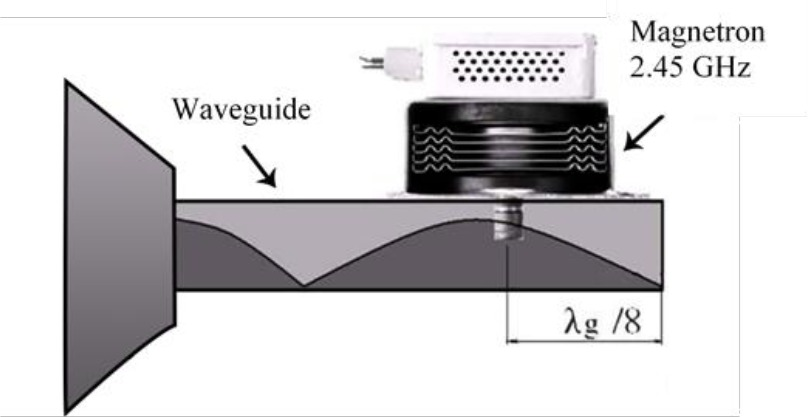 In vacuum tubes, such as the best-known magnetron, the wave tube, and Klystron are all strong sources of microwave power that convert electrical energy into RF energy. We chose the magnetron-like microwave generator for this study because it is an effective and inexpensive device (Chaari, 2015). Typical electricity to RF conversion efficiencies are between 75% and 92%. The Klystron is more costly and not as efficient as a magnetron. Although solid-state FET (Field Effect Transistor) sources are straightforward, they still give low efficiencies compared to power microwave tubes. The output power variety of a magnetron, Pmagnetron, varies from 1 kW to about 1.2 kW. Higher power magnetrons used for industrial applications can generate up to 5.5 kW of output power, as shown in Fig 5. In our research and prototype, we will use the MAG2481 magnetron.