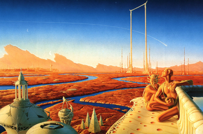 Марсиане в романе Брэдбери – отражение нас с вами. Это древняя и некогда великая раса, способная к телепатии. Они хрупкие, смуглые и с золотыми глазами. Мы видим уже закат их величия, а прибытие людей лишь ускорило конец. Однако не вооруженное столкновение привело к гибели марсиан, а простая ветрянка. На мой взгляд, это отсылка к «Войне миров» Герберта Уэллса.