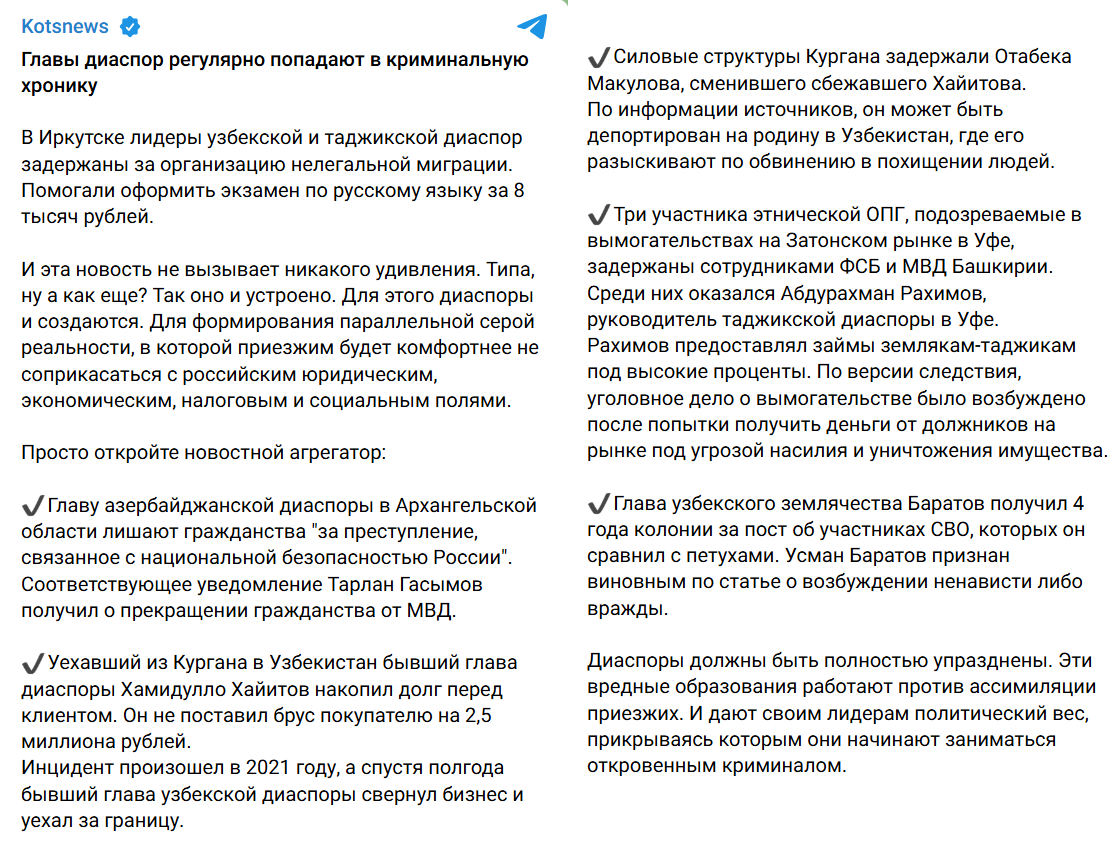 В то время как их функции должны ограничиваться на уровне культурных центров, на деле оказывается, что этнические диаспоры в России часто становятся источниками криминала и пособниками нелегальной миграции. То есть мало чем отличаются от обычных ОПГ.