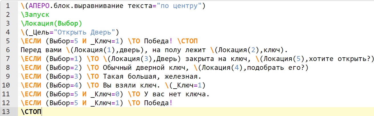Вновь углубимся в само-повторы, взяв для примера текстовый квест из Статьи #8 -> Рыба моей мечты #8 или кручу-верчу, запутать хочу В этот раз, от игрока требуется найти (и подобрать) ключ, и открыть (им же) запертую дверь (и это не лабиринт). Повторяться не буду, код -> https://disk.yandex.ru/d/lTAVu8p7LGGVUA