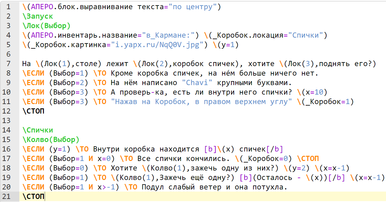 Чтобы добавить в инвентарь предмет, достаточно написать \(_Спички=10) и они там появятся. Помимо декоративной функции, с инвентарём так же можно взаимодействовать. Тратятся спички командой \(_Спички=_Спички-1). Командой \(_Спички.локация="Количество") можно сделать гиперссылку на локацию "Количество". И это только малая часть доступного функционала. Более подробно это описано в Документации -> https://apero.ru/Документация